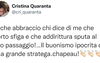 Io che abbraccio chi dice di me che porto sfiga e che addirittura sputa al mio passaggio! Il buonismo ipocrita di una grande stratega, chapeau!