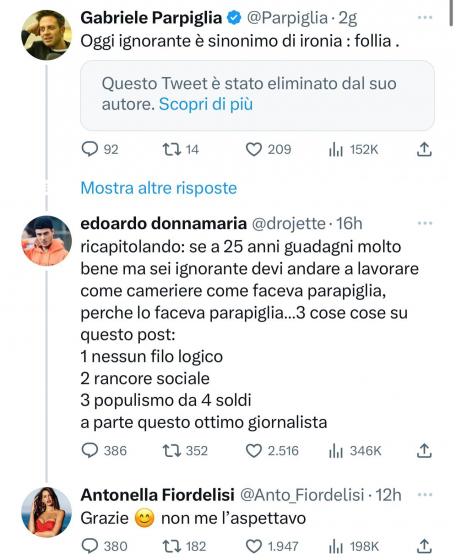 Fra le persone che hanno ironizzato sulla frase di Antonella anche Gabriele Parpiglia. Il giornalista ha ripreso quel video scrivendo “oggi ignorante è sinonimo di ironia. Follia“.