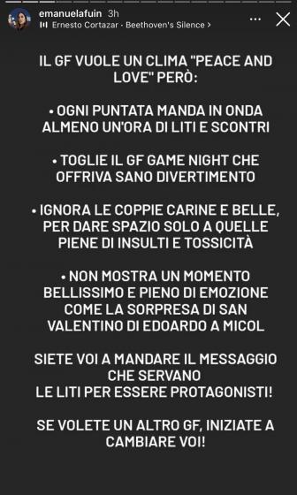 Il GF vuole un clima ‘peace and love’ però: ogni puntata manda in onda almeno un’ora di liti e scontri; toglie il GF Game Night che offriva sano divertimento; ignora le coppie carine e belle, per dare spazio solo a quelle piene di insulti e tossicità; non mostra un momento bellissimo ed emozionante come la sopresa di San Valentino di Edoardo a Micol. Siete voi a mandare il messaggio che servano le liti per essere protagonisti. Se volete un altro GF, iniziate a cambiare voi.
