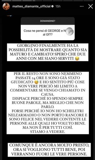 Gf Vip 7, Matteo Diamante fa un’insinuazione sulla sua ex Nikita Pelizon poi aggiunge: “Meglio se non parlo perché…