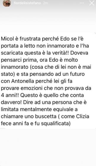 Micol è frustrata perché Edo se l’è portata a letto non innamorato e l’ha scaricata. Questa è la verità! Doveva pensarci prima ora Edo è molto innamorato (cosa che di lei non è mai stato). Sta pensando a un futuro con Antonella perché gli fa provare emozioni che non provava da quattro anni. Questo è quello che conta davvero! Dire a una persona che è limitata mentalmente equivale a chiamare uno Buscetta (come Clizia fece anni fa e fu squalificata).