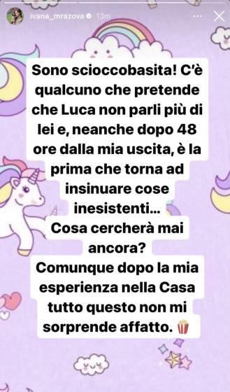 Sono scioccobasita. C’è qualcuno che pretende che Luca non parli più di lei e, neanche dopo 48 ore dalla mia uscita, è la prima che torna ad insinuare cose inesistenti… Cosa cercherà ancora? Comunque dopo la mia esperienza nella Casa tutto questo non mi sorprende affatto.