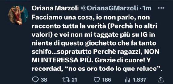 Facciamo una cosa, io non parlo, non racconto tutta la verità, perché ho altri valori, e voi non mi taggate più su IG in niente di questo giochetto che fa tanto schifo. Perché ragazzi non mi interessa più. Grazie di cuore. E ricordatevi, non è oro tutto quello che luccica.