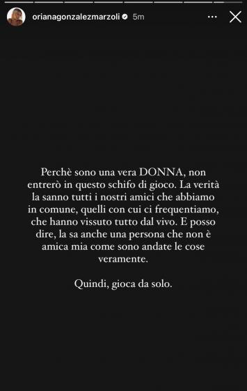 Perché sono una vera donna, non entrerò in questo schifo di gioco. La verità la sanno tutti i nostri amici che abbiamo in comune. Quelli con cui ci frequentiamo, che hanno vissuto tutto dal vivo. E posso dire, lo sa anche una persona che non è amica mia, come sono andate veramente le cose.