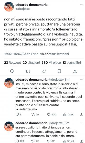 Edoardo Donnamaria ha lasciato un lungo sfogo sul suo profilo Twitter, a proposito della fine della storia d’amore con Antonella Fiordelisi.