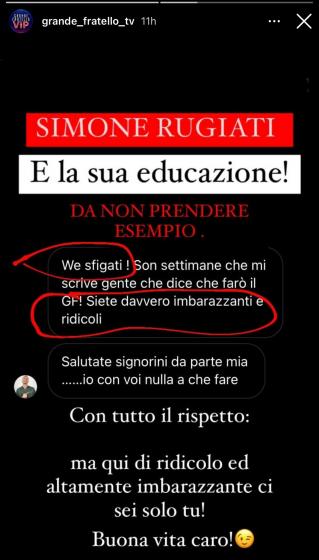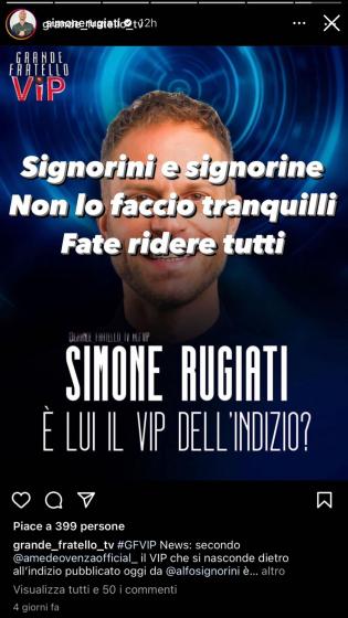 La notizia è stata immediatamente ripresa non solo da diverse pagine social dedicate al programma, ma anche da blog e testate giornalistiche. Simone Rugiati, evidentemente infastidito dal rumor – infondato – ha smentito in modo deciso e anche sorprendente il suo ingresso nella Casa di Cinecittà, con toni poco eleganti. In particolare ha repostato in una storia Instagram una delle fan page del Grande Fratello Vip.