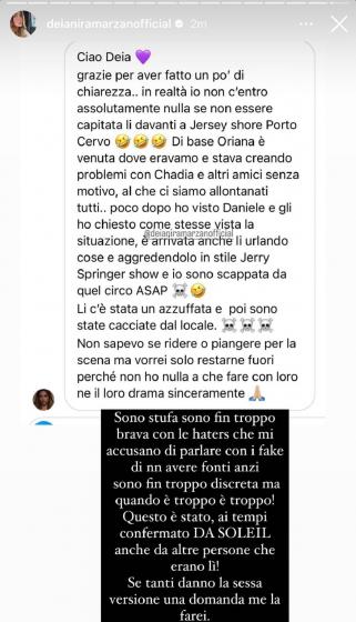 Ciao Deia, grazie per aver fatto un po di chiarezza. In realtà io non c’entro assolutamente nulla se non essere capitata lì davanti a Jersey shore Porto Cervo. Di base Oriana è venuta dove eravamo e stava creando problemi con Chadia e altri amici senza motivo, al che ci siamo allontanati tutti.