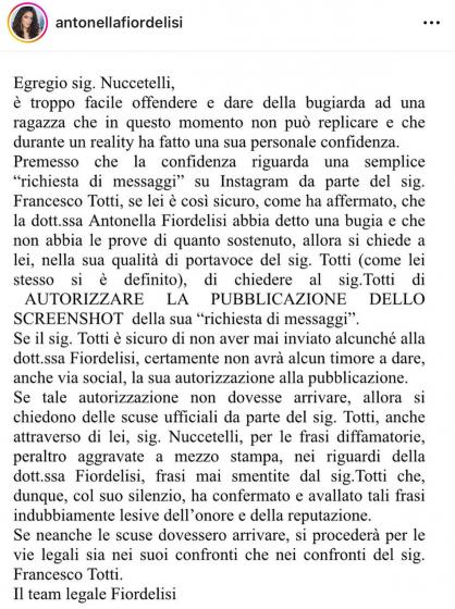 Oggi, a distanza di qualche giorno invece il team legale della Fiordelisi ha deciso di querelare sia Francesco Totti che Alex Nuccetelli.