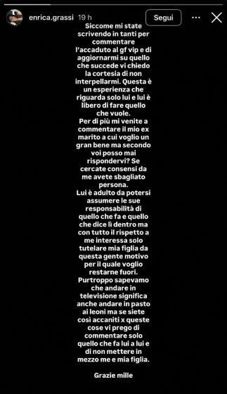 Enrica, a proposito delle innumerevoli segnalazioni sui social circa il comportamento dell’ex marito, ha deciso di intervenire sul suo profilo Instagram. Nello specifico, la Grassi ha sbottato contro chi continua a mettere in mezzo lei e sua figlia, puntualizzando che il ex marito – a cui vuole molto bene – è adulto al punto da assumersi le sue responsabilità.