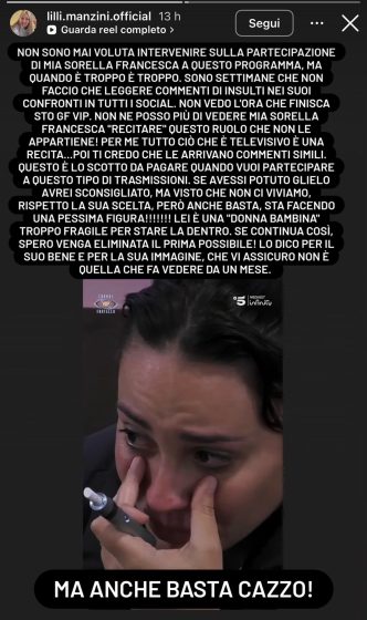 Nono sono mai voluta intervenire sulla partecipazione di mia sorella Francesca a questo programma, ma quando è troppo è troppo. Sono settimane che non faccio che leggere commenti di insulti nei suoi confronti in tutti i social. Non vedo l’ora che finisca sto Gf Vip. Non ne posso più di vedere mia sorella Francesca “recitare” questo ruolo che non le appartiene! Per me tutto ciò che è televisivo è una recita… poi ti credo che le arrivano commenti simili. Questo è lo scotto da pagare quando vuoi partecipare a questo tipo di trasmissioni. Se avessi potuto glielo avrei sconsigliato, ma visto che non ci viviamo, rispetto la sua scelta però anche basta, sta facendo una pessima figura! Lei è una “donna bambina” troppp fragile per stare là dentro. Se continua così spero venga eliminata il prima possibile! Lo dico per il suo bene e per la sua immagine che vi assicuro non è quella che fa vedere da un mese. Ma anche basta ca*zo!