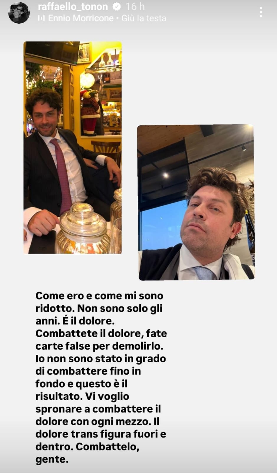 Nelle sue storie Instagram, Tonon ha pubblicato due fotografie significative: una che lo ritrae in un momento passato e una più recente, evidenziando un evidente cambiamento fisico. Accompagnando le immagini, ha spiegato che quel cambiamento non è stato casuale, ma il risultato del dolore che ha attraversato. Ha scritto Raffaello, evidenziando come le sofferenze personali possano segnare profondamente, tanto da lasciare tracce visibili anche sul corpo.