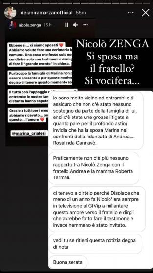 Qualche giorno dopo – a seguito delle numerose ipotesi – è stato lo stesso Nicolò a spiegare tramite una Instagram Stories il motivo per cui la sua famiglia non era presente alle nozze. Nello specifico Zenga ha dichiarato che la scelta di tenere questo momento solo per loro era riconducibile al fatto che la famiglia di Marina non poteva essere presente.