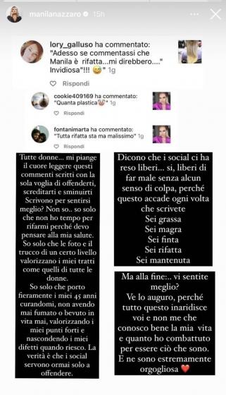 Dopo aver pubblicato alcune foto sul suo profilo Instagram, un’ex concorrente della sesta edizione del Gf Vip è stata presa di mira dagli hater. Manila Nazzaro, l’ex Vippona a finire nel mirino dei leoni da tastiera, è stata accusata di essere tutta rifatta”.