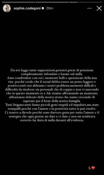 Da ieri leggo tante supposizioni, pensieri, prese di posizione completamente infondate e basate sul nulla. Amo condividere con voi i momenti belli e spensierati della mia vita perché credo che il social debba essere un posto leggero e positivo, tutti noi abbiamo i nostri problemi, momenti difficili e difficoltà da risolvere sia personali che di coppia e non vi nascondo che in questo momento io e Ale stiamo affrontando un momento abbastanza delicato della nostra storia che siamo cercando di superare per il bene della nostra famiglia.