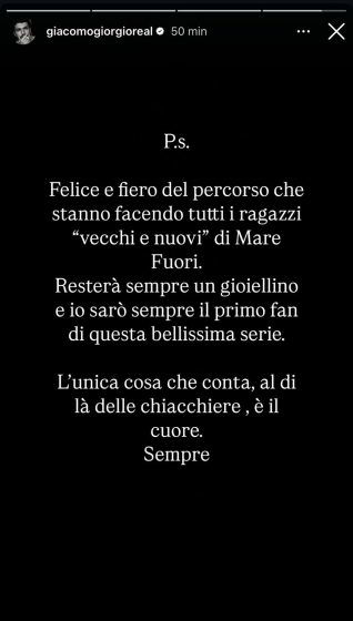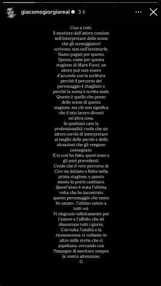 Ciao a tutti. Il mestiere dell’attore consiste nell’interpretare delle scene che gli sceneggiatori scrivono, non nell’inventarle. Siamo pagati per questo. Spesso, come per questa stagione di Mare Fuori, un attore può non essere d’accordo con la scrittura perché il percorso del personaggio è sbagliato e perché la scena è scritta male. Questo è quello che penso delle scene di questa stagione, ma ciò non significa che il mio lavoro diventi un’altra cosa. In qualsiasi caso la professionalità vuole che un attore cerchi di interpretare al meglio delle parole e delle situazioni che gli vengono consegnate. E io così ho fatto, quest’anno e gli anni precedenti. Credo che il vero percorso di Ciro sia iniziato e finito nella prima stagione, e questo niente lo potrà cambiare. Quest’anno è stata l’ultima volte che ho incontrato questo personaggio che ho tanto amato, l’ultimo saluto a tuti voi. Vi ringrazio infinitamente per l’amore e l’affetto che mi dimostrate tutti i giorni. Con tutta l’umiltà e la riconoscenza ci vediamo in altre mille storie che ci aspettano, cercando con l’impegno di meritare sempre la vostra attenzione. G
