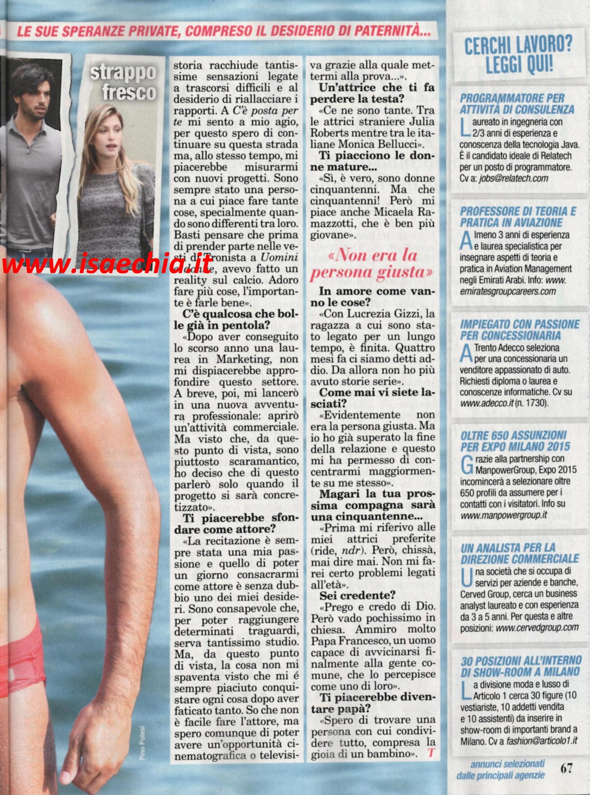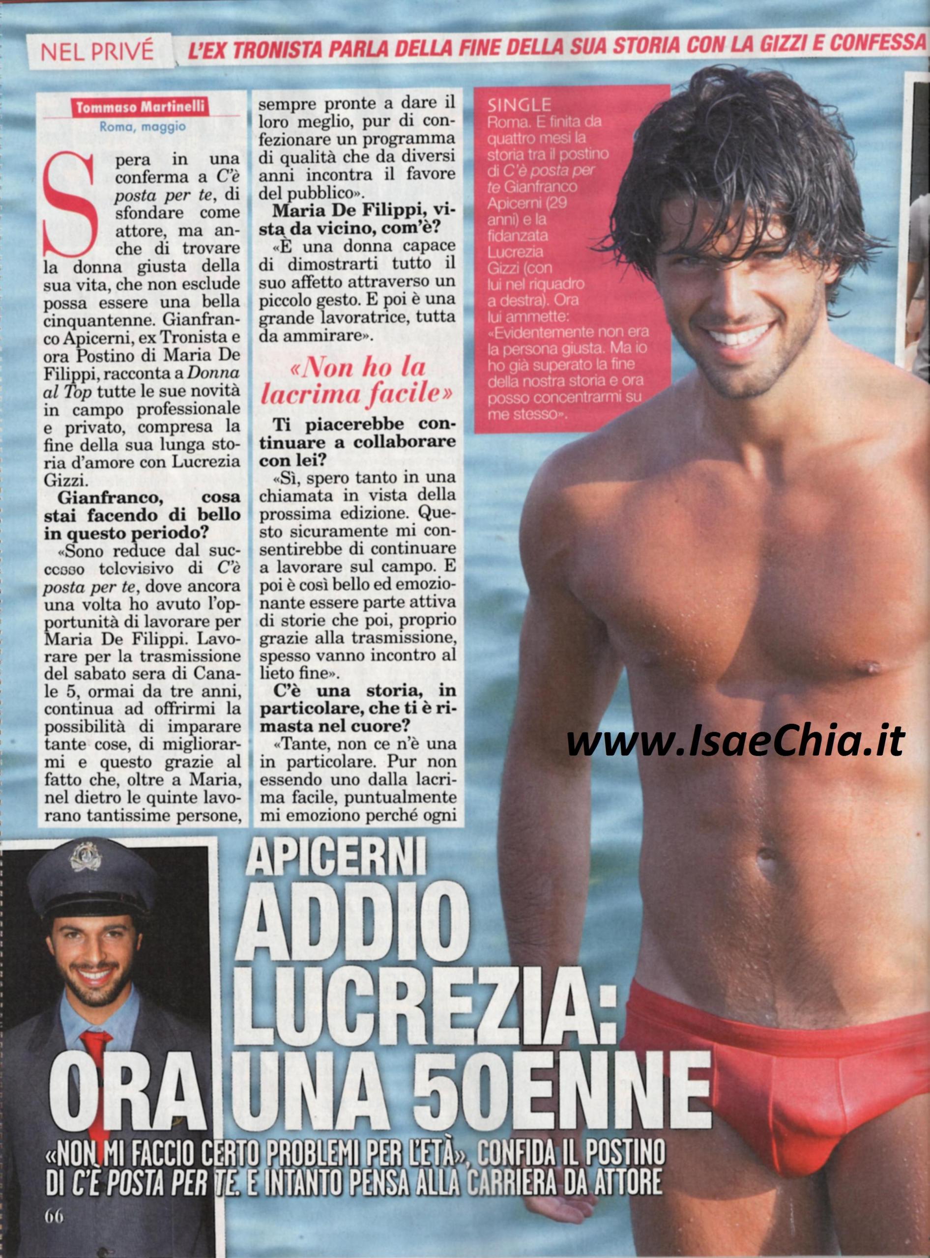 L’ex tronista Gianfranco Apicerni è stato promosso da Maria De Filippi a “postino” di C’è posta per te: “Lavorare nella trasmissione televisiva del sabato sera da tre anni mi dà la possibilità di imparare tante cose, di migliorarmi, grazie al fatto che dietro le quinte ci sono tante persone che sempre pronte a dare del loro meglio con un programma di qualità. Maria De Filippi è una donna capace di dimostrarti tutto il suo affetto con un piccolo gesto, è una grande lavoratrice ed è tutta da ammirare. Spero in una chiamata per la prossima edizione; è emozionante sentirsi parte attiva di storie che spesso, grazie al programma, vanno incontro a un lieto fine. Pur non essendo di lacrima facile, spesso mi emoziono con le storie legate a trascorsi difficili e la volontà di riallacciare i rapporti. Al contempo, mi piacerebbe misurarmi con nuovi progetti: dopo aver conseguito la laurea in Marketing l’anno scorso, mi piacerebbe approfondire questo settore. A breve mi lancerò in una nuova avventura: aprirò un’attività commerciale, ma visto che sono scaramantico, ne parlerò solo quando il progetto si sarà concretizzato. La recitazione è sempre stata una mia passione e uno dei miei sogni è quello di consacrarmi come attore. Tuttavia, sono consapevole del fatto che bisogni studiare e faticare tanto. Tra le attrici che mi fanno perdere la testa ci sono Julia Roberts e Monica Bellucci“. Quando gli si fa notare che sono donne mature, risponde: “Sì, è vero, sono cinquantenni, ma che cinquantenni! Tra le italiane mi piace anche Micaela Ramazzotti, che è ben più giovane”. E quando gli si chiede dell’amore, risponde: “Con Lucrezia Gizzi, con cui sono stato fidanzato a lungo, è finita quattro mesi fa. Evidentemente non era la persona giusta, ma ho superato la fine della relazione e mi sono concentrato più su me stesso”. Infine, chiedendogli se allora la prossima sarà una cinquantenne, risponde: “Prima mi riferivo alle mie attrici preferite! Però, mai dire mai. Non mi farei certo problemi legati all’età”.