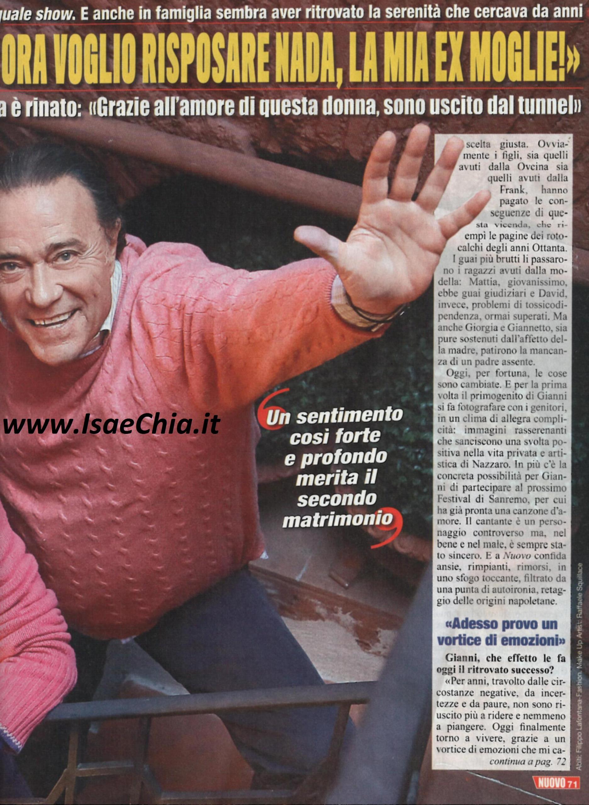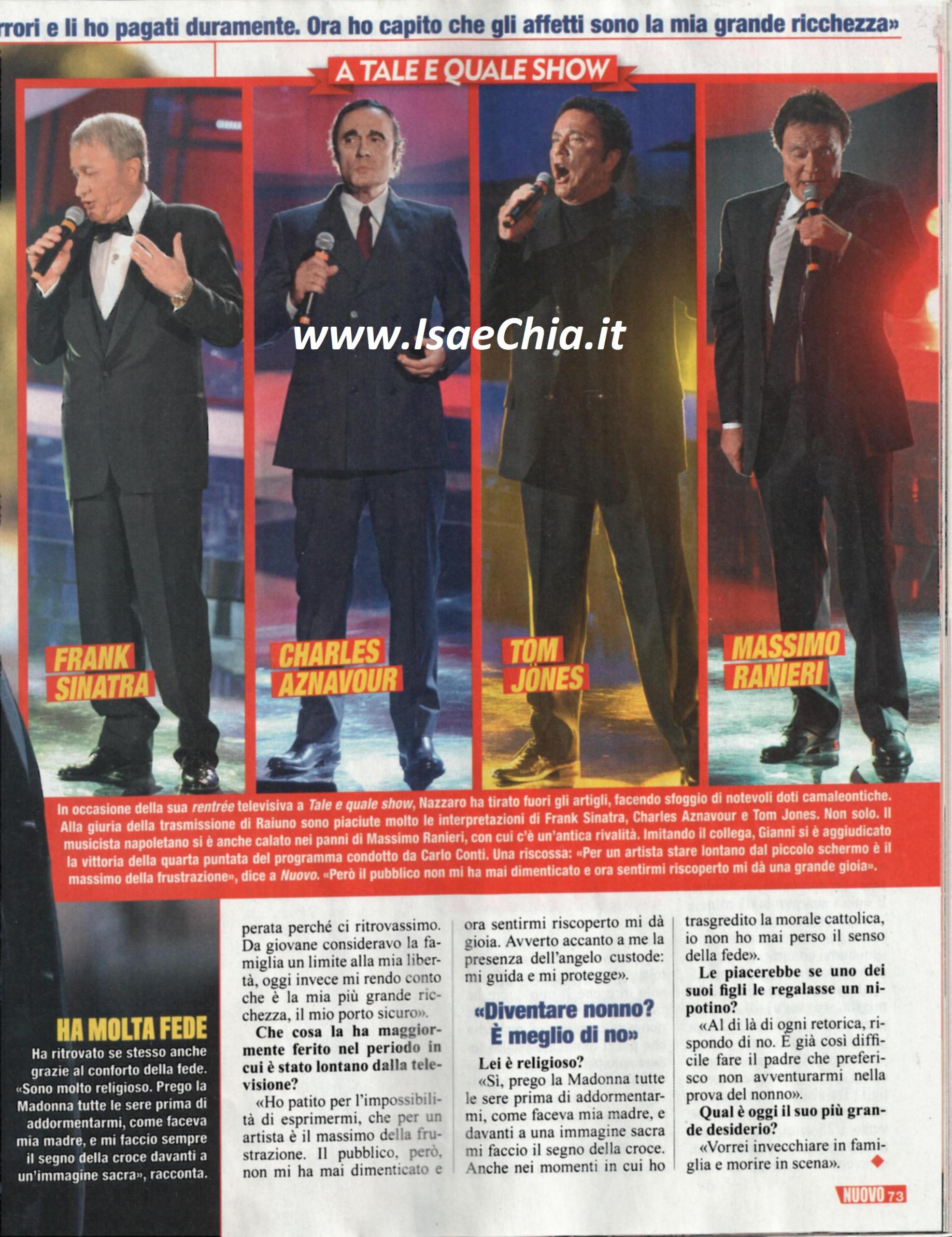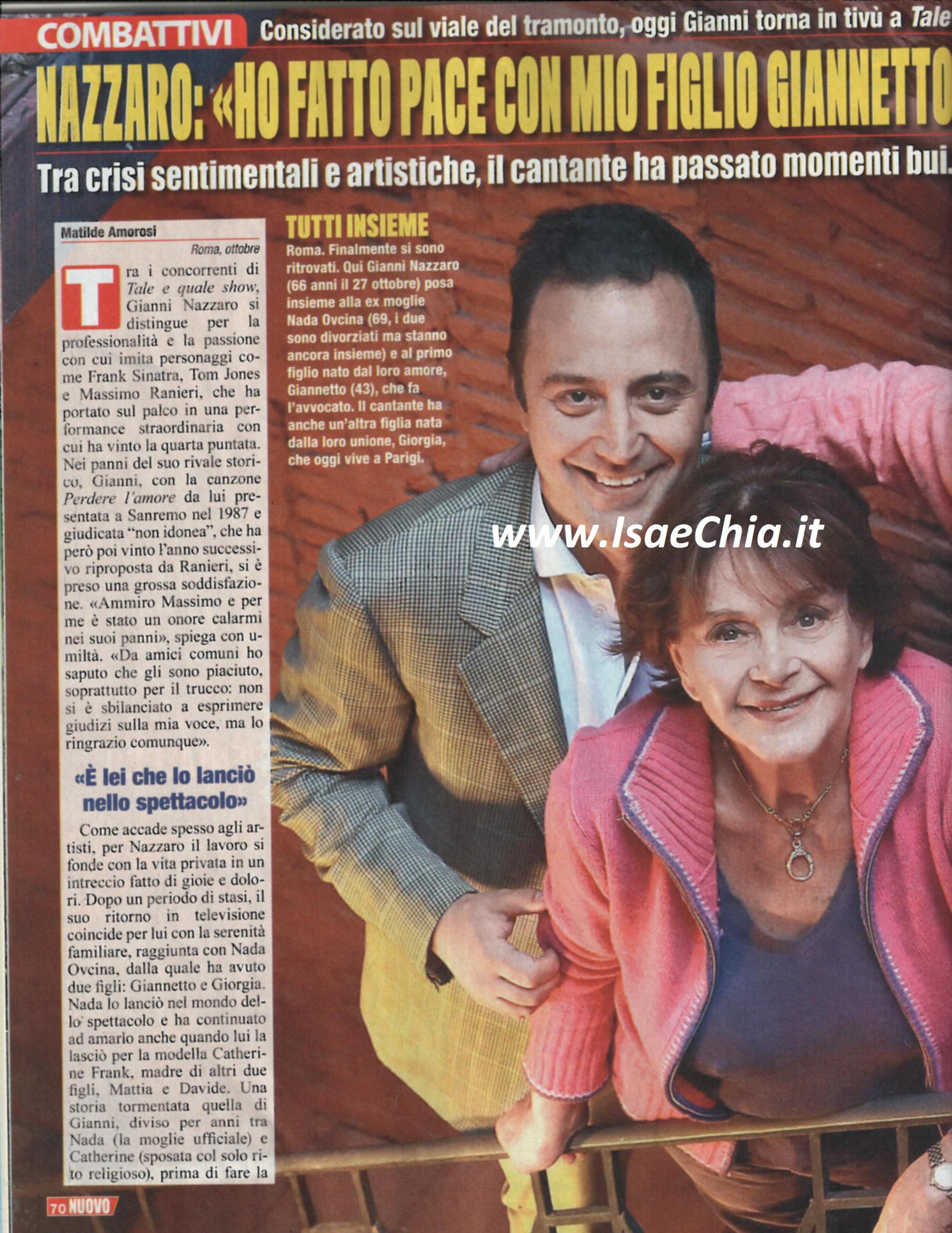 Gianni Nazzaro è tra i concorrenti del Tale e quale show, di cui ha vinto la quarta puntata grazie all’imitazione di Massimo Ranieri. “Ho saputo tramite amici comuni che gli è piaciuta l’imitazione, specialmente il trucco. Sulla voce non si è espresso, ma sono comunque contento” dice lui, Per il cantante, inoltre, è un periodo di serenità anche nella vita privata: dopo una storia con la modella Catherine Frank, infatti, è tornato con la prima moglie Nada Ovcina, dalla quale aveva avuto due figli, Giannetto e Giorgia. Gli altri due figli nati dalla seconda moglie, Mattia e David, hanno avuto guai giudiziari e di tossicodipendenza, mentre i primi hanno sofferto per l’assenza del padre. Oggi, per fortuna, le cose sono cambiate: “Per anni, travolto a circostanze negative, incertezze e paure, non sono riuscito né a ridere né a piangere. Oggi finalmente torno a vivere. Per questo devo ringraziare Nada: nonostante io l’abbia fatta soffrire, lei mi è rimasta sempre vicina e ha lottato perché io tornassi alla ribalta. Per tutti lei è mia moglie, ma in realtà siamo divorziati. Ecco perché ho deciso di risposarla. E’ possibile che mio figlio Giannetto sia il testimone di nozze: negli ultimi anni ci siamo ritrovati. Il nostro rapporto si è rovesciato ed è lui a farmi da padre, nel senso che mi consiglia ed è protettivo nei miei confronti. Quando ha saputo che avrei imitato Ranieri, mi ha detto: “Ci vuole coraggio, ma provaci, perché ne vale la pena”. Nada ha spinto lui e Giorgia a volermi bene comunque, ed è per questo che è stato possibile riprendere un dialogo. Con gli altri miei figli, invece, Catherine ha inculcato odio nei miei confronti e solo ora che sono due uomini abbiamo ripreso a parlare. Come padre mi do un voto bassissimo: ho commesso tanti errori e credo che mi sentirò sempre in colpa. Oggi ho il diritto di uscire da questo tunnel e iniziare una nuova fase ella vita accanto ai miei figli. Durante il periodo di assenza dalle scene, ho patito per l’impossibilità di esprimermi, che per un artista è il massimo della frustrazione. Il pubblico però non mi ha mai dimenticato e ora sentirmi riscoperto mi dà gioia”.
