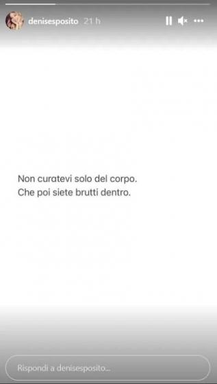 La ragazza, oggi, ha pubblicato una storia su Instagram che viste le tempistiche in molti sui social hanno pensato che sia riferita alla Tatangelo. “Non curatevi solo del corpo che poi siete brutti dentro.” ha scritto Denise sul suo profilo. La compagna del cantautore non ha fatto nessun nome e non si è mai esposta sulla storia passata del suo compagno.