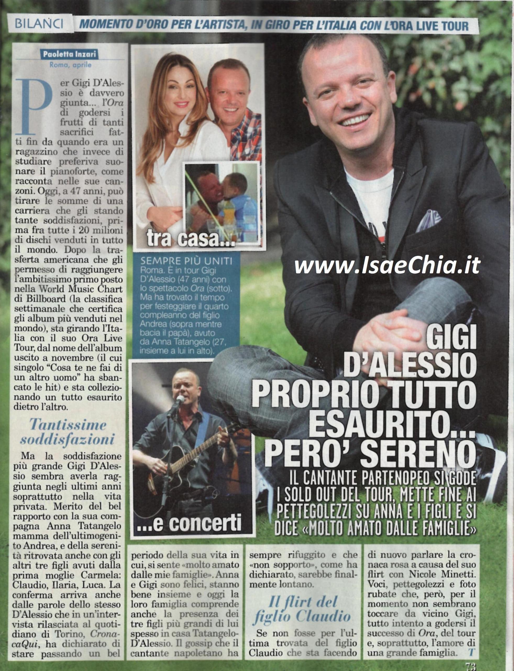 Dopo la trasferta americana che gli ha permesso di raggiungere il primo posto nel World Music Chart di Billboard (la classifica che certifica gli album più venduti al mondo), Gigi D’Alessio sta girando l’Italia con il suo Ora Live Tour e sta registrando un “tutto esaurito” dietro l’altro. Ma per Gigi la più grande soddisfazione è quella ottenuta nella vita privata, merito della bella unione con Anna Tatangelo, mamma dell’ultimogenito Andrea, e della serenità ritrovata con i primi tre figli, Claudio, Ilaria e Luca. Al quotidiano CronacaQui di Torino, infatti, ha dichiarato di “sentirsi molto amato dalle sue famiglie” e il gossip che lui poco sopporta e che lo vuole sempre in crisi con Anna pare finalmente lontano…Se non fosse per l’ultima trovata di suo figlio Claudio! Pare, infatti, che abbia un flirt con l’ex consigliera regionale Nicole Minetti. Per ora, però, le foto e i pettegolezzi non toccano Gigi, che si gode il successo del suo tour e la serenità della sua famiglia.