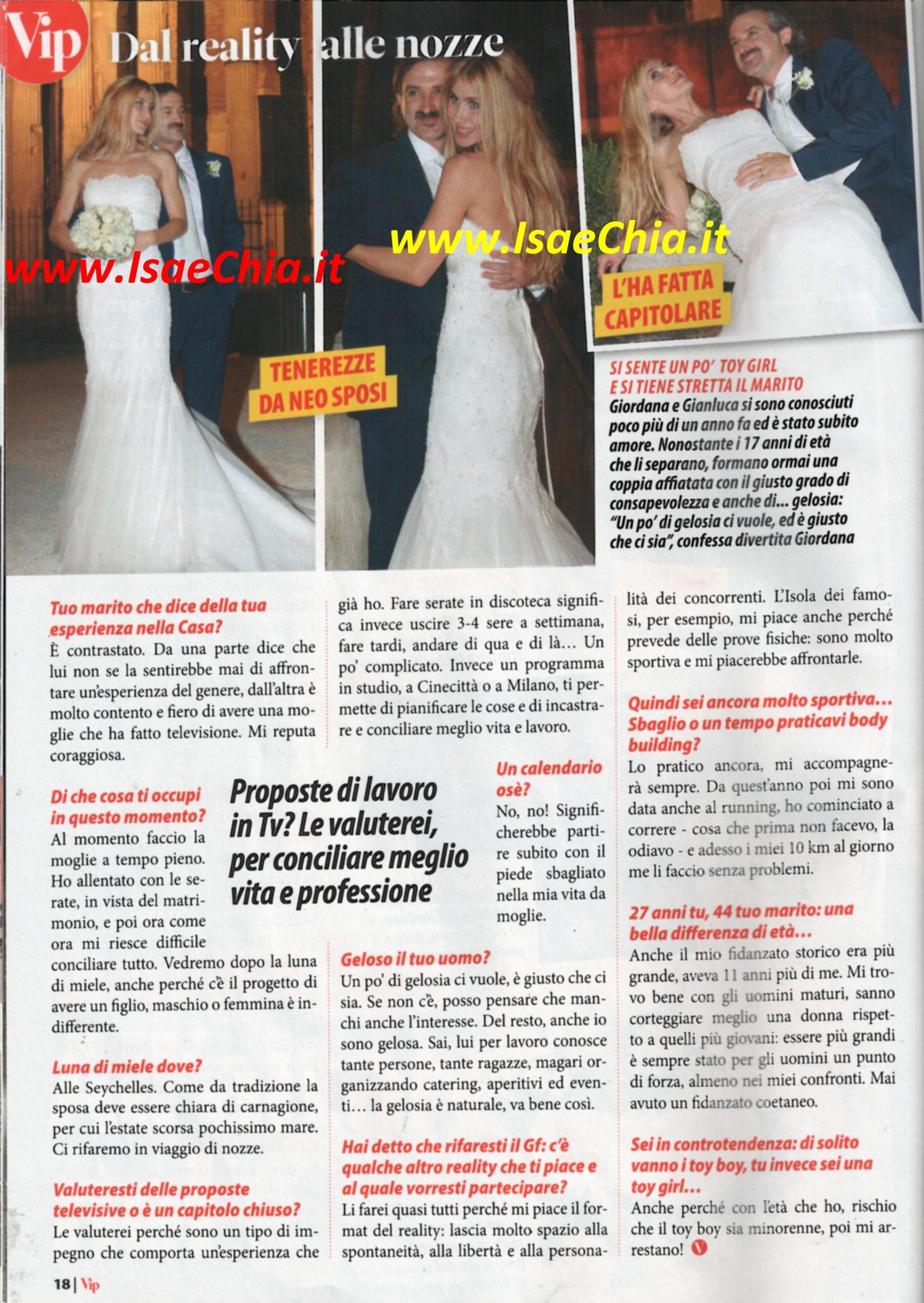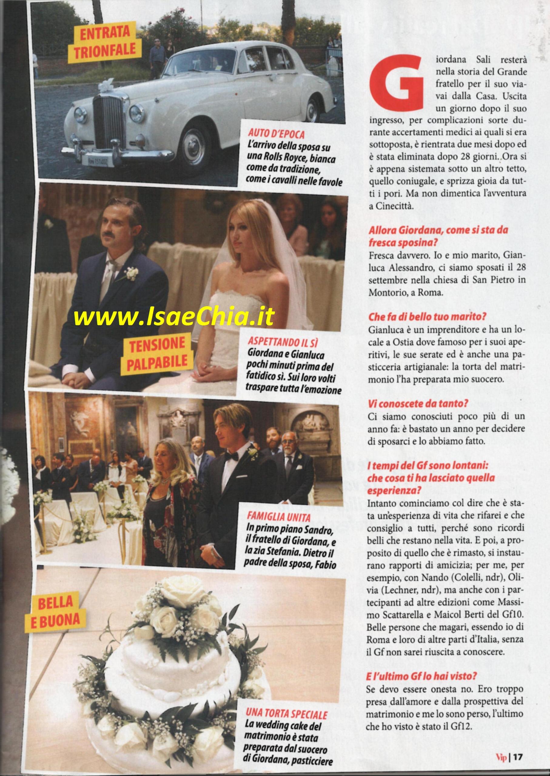 Al Grande fratello 11, Giordana Sali era riuscita a battere al televoto la favorita Guendalina Tavassi, anche se poco dopo ha dovuto abbandonare anche lei la Casa. Adesso, però, la biondissima gieffina si ritrova a varcare una nuova soglia: quella della casa dove vive con suo marito. Lo scorso 28 settembre, infatti, ha sposato nella Chiesa di S. Pietro in Montorio a Roma Gianluca Alessandro, di 17 anni più grande: “Mio marito è un imprenditore e ha un locale a Ostia famoso per i suoi aperitivi e le sue serate. E’ anche una pasticceria artigianale: la torta nuziale l’ha preparata mio suocero. Ci siamo conosciuti poco più di un anno fa: è bastato meno di un anno per decidere di sposarci e l’abbiamo fatto”. Ricordando invece i tempi del Grande fratello, racconta: “E’ stata un’esperienza di vita bellissima che consiglio a tutti, si instaurano dei rapporti di amicizia, nel mio caso con Nando Colelli e Olivia Lechner, ma anche con partecipanti di altre edizioni, come Massimo Scattarella e Maicol Berti. L’ultimo GF che ho visto è stato il 12, l’ultima edizione non l’ho vista perché ero presa dai preparativi del matrimonio. Mio marito ha un’opinione contrastata a riguardo: da una parte dice che non riuscirebbe ad affrontare un’esperienza del genere, dall’altra dice di avere una moglie coraggiosa perché ho fatto televisione. Al momento ho allentato con le serate e faccio la moglie a tempo pieno: ora andiamo in luna di miele alle Seychelles e c’è in progetto un figlio. Valuterei delle proposte in tv, perché comportano un tipo di esperienza che già ho: un programma in studio ti permette di pianificare le cose e i conciliare vita e lavoro. Un calendario osé? No: significherebbe partire subito col piede sbagliato nella mia vita da moglie! Un altro reality sì, perché mi piace proprio il format del reality, che lascia spazio alla spontaneità e alla personalità. L’isola dei famosi mi piacerebbe perché prevede prove fisiche e io sono molto sportiva! Pratico ancora boy-building e ho cominciato anche a correre!”. Quando le si chiede e la differenza d’età col marito, risponde: “Anche il mio fidanzato storico era più grande, di 11 anni. Mi trovo bene con gli uomini più maturi: sanno corteggiare meglio rispetto a quelli giovani. Essere grandi è stato sempre un punto di forza negli uomini, almeno nei miei confronti. Mai avuto un fidanzato coetaneo. Anziché avere un toy-boy, sono una toy-girl, anche perché con l’età che ho, rischio che il toy-boy sia minorenne… E poi mi arrestano!”