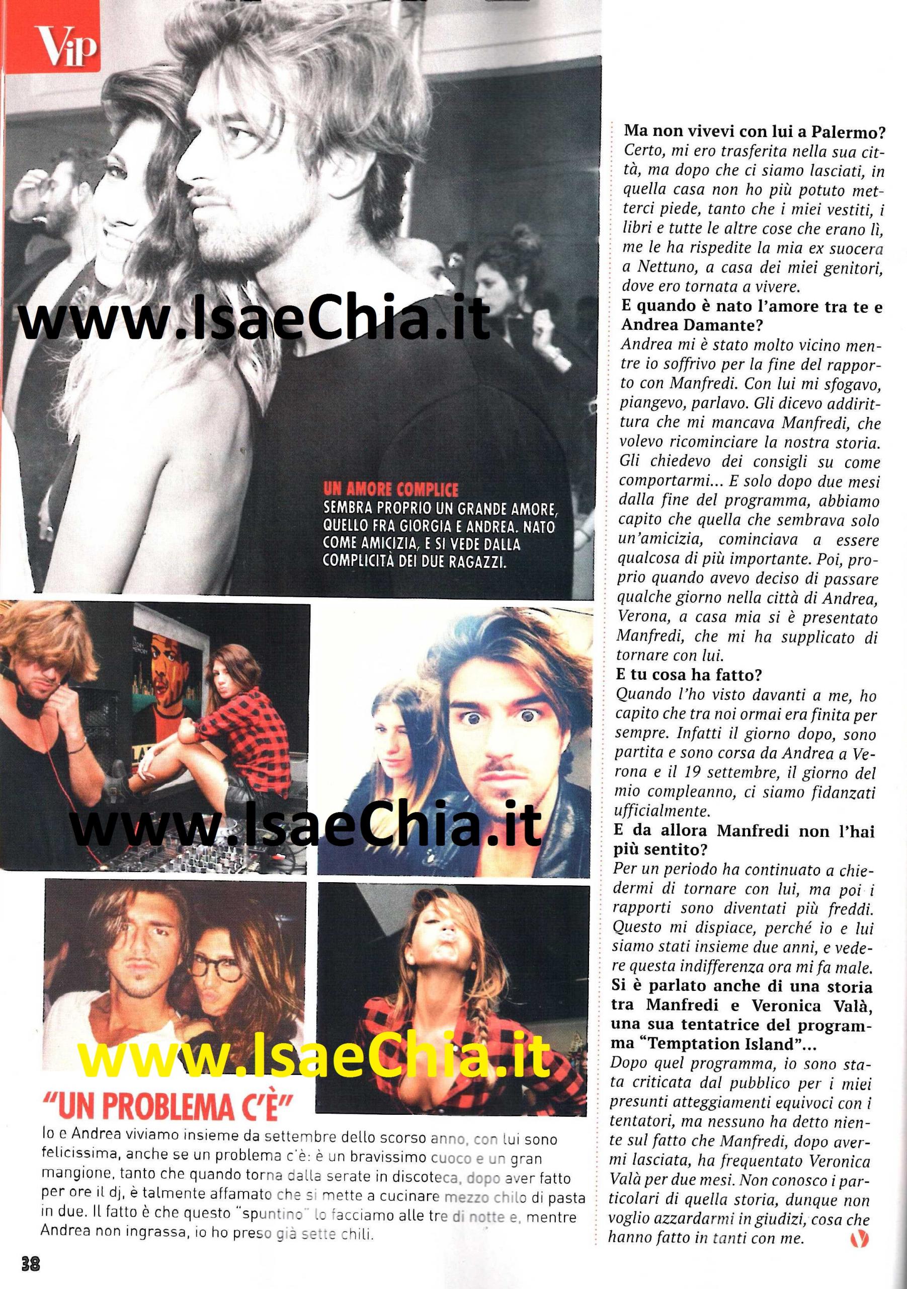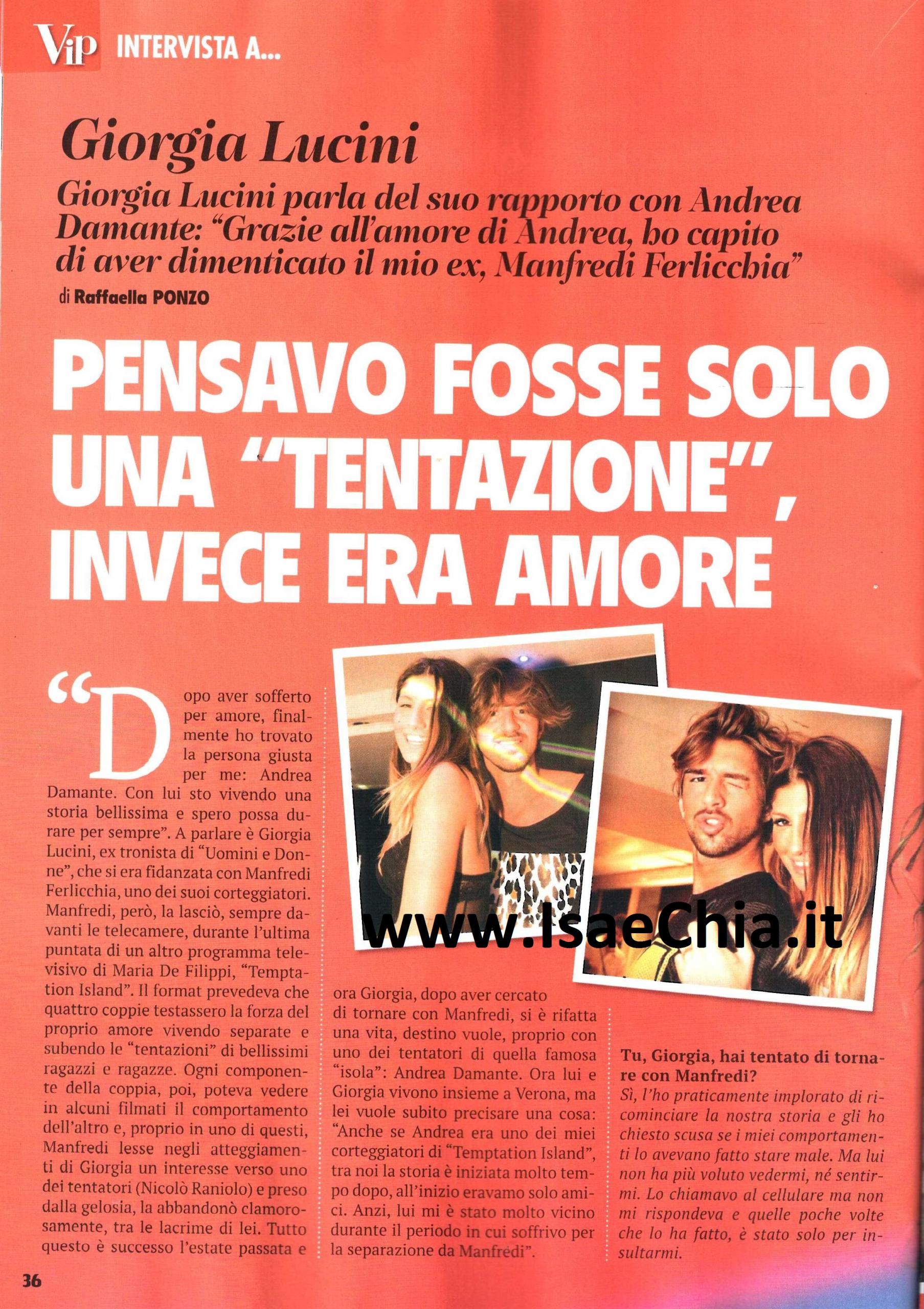 “Dopo aver sofferto per amore, finalmente ho trovato la persona giusta per me: Andrea Damante. Con lui sto vivendo una storia bellissima e spero possa durare per sempre“. A parlare è l’ex tronista Giorgia Lucini, che a Uomini e Donne aveva scelto Manfredi Ferlicchia. Poi, però, dopo due anni di fidanzamento, tra di loro è finita a causa della gelosia di lui dopo aver messo il loro amore alla prova a Temptation Island. “Anche Andrea era uno dei ‘tentatori’ di Temptation Island, ma voglio specificare che la nostra storia è iniziata molto tempo dopo. All’inizio eravamo solo amici e lui mi è stato vicino durante il periodo in cui soffrivo per la separazione da Manfredi. Io ho praticamente implorato Manfredi di ricominciare la nostra storia e gli ho chiesto scusa se i miei comportamenti lo avevano fatto stare male. Non mi rispondeva al cellulare e quando lo faceva, era solo per insultarmi. Io mi ero trasferita nella sua città, Palermo, ma dopo che ci siamo lasciati, in quella casa non ho più potuto mettere piede, tanto che i miei vestiti, i libri e tutte le altre cose me le ha rispedite la mia ex suocera a casa dei miei a Nettuno” racconta lei. Quando le si chiede quando è nata invece la storia con Andrea, Giorgia racconta: “Mi è stato vicino, con lui mi sfogavo, piangevo, parlavo. Gli dicevo addirittura che mi mancava Manfredi, che volevo ricominciare la nostra storia. Gli chiedevo come comportarmi. E solo due mesi dopo la fine del programma, ci siamo resi conto che quella che sembrava solo un’amicizia cominciava ad essere qualcosa di più importante. Poi, proprio quando avevo deciso di passare qualche giorno a Verona da Andrea, si è presentato a casa mia Manfredi. Quando l’ho visto davanti a me, gli ho fatto capire che era finita per sempre. Il giorno dopo sono partita per Verona e il 19 settembre, giorno del mio compleanno, ci siamo fidanzati ufficialmente. Per un po’ Manfredi ha continuato a chiedermi di tornare con lui ma poi i rapporti sono diventati freddi. Questo mi dispiace, perché siamo stati insieme due anni e vedere quest’indifferenza mi fa male. Io sono stata criticata per i miei presunti atteggiamenti equivoci con i tentatori, ma nessuno ha detto niente sul fatto che Manfredi, dopo avermi lasciata, ha frequentato Veronica Valà per mesi. Non conosco i particolari della loro storia, quindi non voglio azzardarmi in giudizi. Cosa che in tanti hanno fatto con me“.
