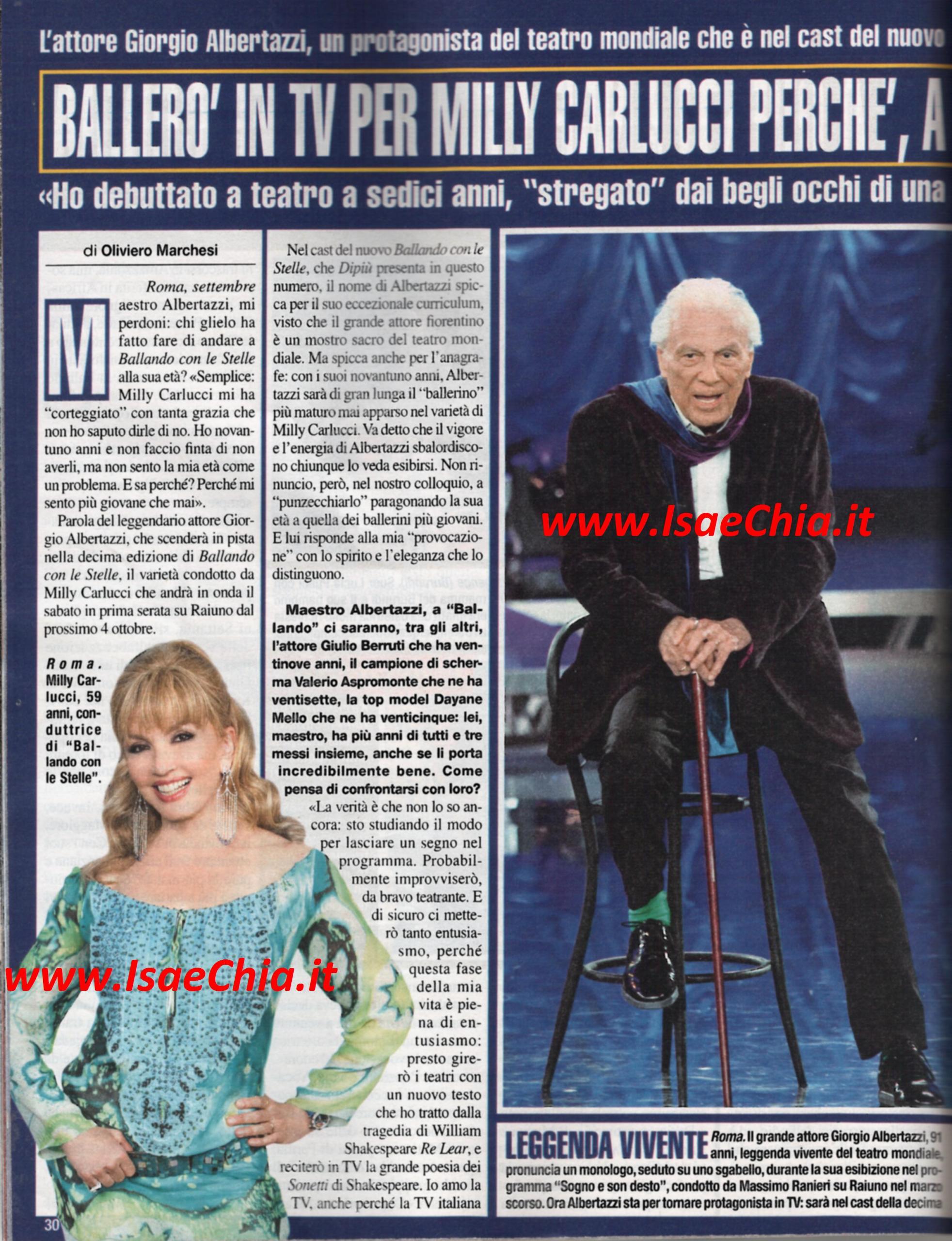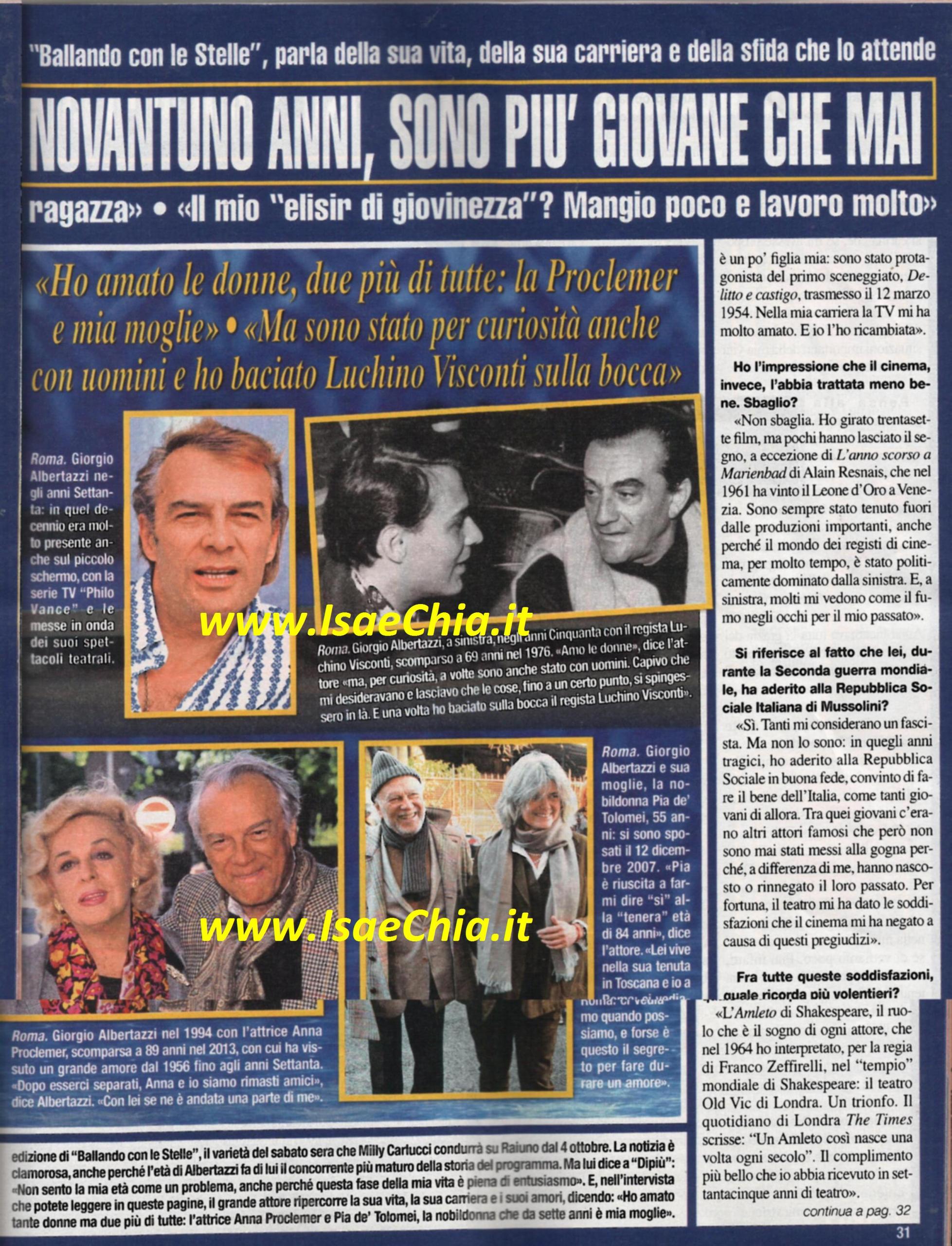 A breve ripartirà Ballando con le stelle e Milly Carlucci ha presentato un cast d’eccezione: l’attrice di Beautiful Katherine Kelly Lang (che interpreta Brooke), l’attore Giulio Berruti, la presentatrice e attrice Giorgia Surina, la collega Marisa Laurito, il comico Teo Teocoli, il cantante neomelodico Tony Colombo, la top model Dayane Mello e dal mondo dello sport Andrew Howe, Valerio Aspromonte, Vincent Candela e Giusy Versace, che ha due protesi al posto delle gambe. Ma la punta di diamante è l’attore Giorgio Albertazzi, che con i suoi 91 anni, è il concorrente più anziano di tutte le edizioni: “Sto studiando un modo per lasciare un segno nel programma” dice lui. “Probabilmente improvviserò, da bravo teatrante, e sicuramente ci metterò tanto entusiasmo, perché questa fase della mia vita è piena di entusiasmo: presto girerò i teatri con il Re Lear di Shakespeare. Io amo la tv italiana, perché sono stato protagonista del primo sceneggiato, Delitto e castigo, andato in onda nel 1954. Ho girato 37 film, ma pochi hanno lasciato il segno: sono stato tenuto fuori da produzioni importanti perché il mondo del cinema è stato a lungo politicamente schierato a sinistra. Per fortuna, il teatro mi ha dato soddisfazioni. La più grande è l‘Amleto di Shakespeare, il sogno di ogni attore, che nel 1964 è stato un trionfo all’Old Vic di Londra”. Parlando dei suoi amori, si lascia andare anche a grandi rivelazioni: “Con la morte di Anna Proclemer, se n’è andata una parte di me. Il nostro amore, nato nel ’56, ha accompagnato una lunga parte della nostra vita e fra noi è rimasta una grande intesa, ma non le ho mai proposto di sposarmi: ero convinto che il matrimonio non fosse per me. Poi, sette anni fa, mi sono sposato. Lei si chiama Pia De’ Tolomei, è una nobildonna toscana discendente della stessa Pia De’ Tolomei della Divina Commedia. Ha portato tanta allegria nella mia vita, anche se ci vediamo poco, perché lei non lascia la sua tenuta in Maremma: forse il segreto per un buon matrimonio è vedersi poco! Mia moglie non è gelosa: diventa amica delle mie “amiche”. Così, quando gli si chiede se vuole intendere che l’ha tradita, risponde: “Tradire è una brutta parola, io mi innamoro di tutte. Sono innamoramenti che non tolgono mia moglie dal piedistallo, a volte passano per l’eros, per l’attrazione. Mi è capitato anche con gli uomini. Di rado, ma è successo. Quando capivo che un uomo mi desiderava, lasciavo che le cose si spingessero più in là: una volta, ad esempio, ho baciato il regista Luchino Visconti. Ma non mi sono mai innamorato di un uomo. Il vero oggetto del mio desiderio sono sempre state le donne. I segreti della mia vitalità? 1) mangio solo lo stretto necessario 2) non mangio carne 3) mangio prima il cibo crudo e poi quello cotto: aiuta contro i radicali liberi 4) mangio adagio. Ma l’elisir di giovinezza è continuare a fare progetti: io ci ho messo 91 anni per diventare giovane come sono ora”.