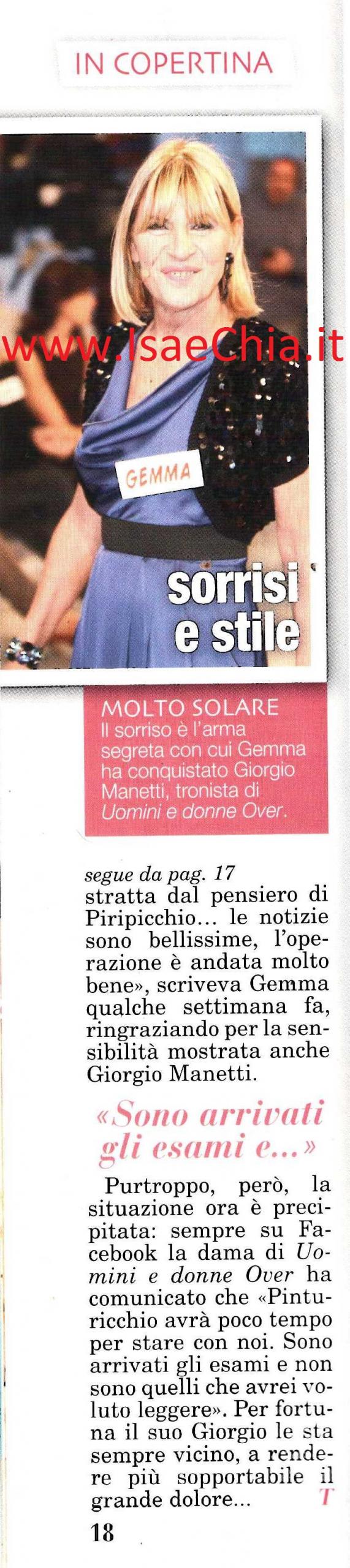 Milioni di telespettatori e share alle stelle quando la puntata è dedicata a loro: Gemma Galgani e Giorgio Manetti, meglio conosciuti come ‘Gem‘ e ‘George‘ sono stati i nuovi protagonisti di questi ultimi mesi a Uomini e Donne. Lei è in quegli studi sin dalla prima puntata, lui è giunto come un fulmine a ciel sereno e ha cominciato a corteggiarla nonostante lei avesse qualche anno in più. Ma lui, spinto dalla filosofia del ‘gabbiano’, decide di non legarsi mai a lei in maniera unica e continua a conoscere altre donne, nonostante la relazione tra loro proceda ormai da mesi e…sia piuttosto profonda: “Io la desidero, anche se ho avuto tantissime donne e se continuano a considerarmi un latin lover. Facciamo l’amore, come accade in tutte le coppie normali. Gem è una donna molto passionale” dichiara lui. Inoltre, il 59enne fiorentino aggiunge: “L’attrazione fisica fine a se stessa non basta, io ho bisogno di più e questo lo ricevo da lei. Sono un po’ complesso, vivo giorno per giorno“. La storia tra i due ‘Over’ ha colpito talmente il pubblico da portare persino un’altra signora della tv ad invitarli nel suo programma: Barbara D’Urso. Pare, infatti, che dopo la prima ospitata a Pomeriggio Cinque, continuerà ad invitarli anche nelle prossime stagioni. Così come è probabile che i due siano presenti a settembre di nuovo a Uomini e Donne. Quello che non è dato sapere, è se saranno ospiti tra le coppie felici che si sono formate nel programma, o saranno ancora in gioco per conoscere nuove persone! Eppure, anche se Gemma si strugge d’amore per il suo George, in realtà, da anni, il suo cuore è tutto per un altra creatura che la aspetta a casa tutte le sere, con cui divide il letto e una storia meravigliosa. Si tratta del dolce gatto Piripicchio, un gatto grigio fumo tutto coccole, come la padrona. Nelle ultime settimane, mentre in tv si destreggiava tra i sentimenti per Giorgio e le possibili rivali, Gemma viveva a casa il dramma della malattia del suo gatto, finito addirittura in sala operatoria. Una vicenda seguita anche dai suoi sostenitori su Facebook: “Rompo il silenzio per riconoscenza, per come mi siete stati vicini, perché mi avete confortata, seguita, distratta dal pensiero di Piripicchio… Le notizie sono bellissime, l’operazione è andata molto bene” ha scritto lei ai fan. Poco tempo fa, però, la Dama ha aggiornato i suoi seguaci sulla situazione, che sembra precipitare: “Pinturicchio (così come l’ha ribattezzato Giorgio) avrà poco tempo per stare con noi. Sono arrivati gli esami e non sono quelli che avrei voluto leggere“. Per fortuna, Giorgio le starà vicino per rendere più sopportabile il dolore…