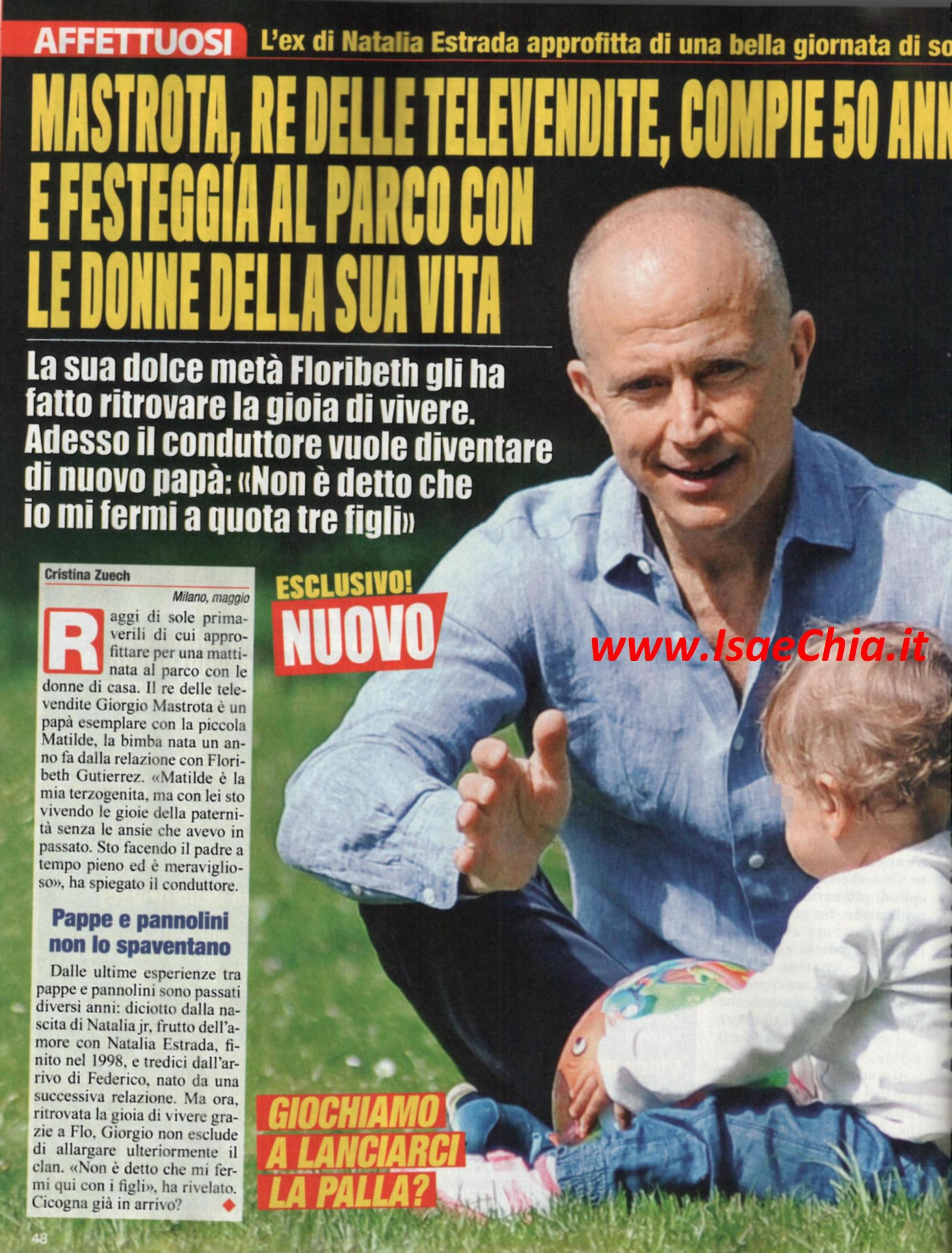 Oggi, 15 maggio, Giorgio Mastrota compie 50 anni. E ne è passato di tempo, da quando, ancora in età da playboy, accettò uno dei primi “troni” di Uomini e donne per trovare quella giusta. Adesso, finalmente, ci è riuscito e se l’è tenuta stretta! Lei è Floribeth Gutierrez, da cui ha avuto la piccola Matilde. “Matilde è la mia terzogenita, ma con lei sto vivendo le gioie della paternità senza l’ansia del passato. Sto facendo il padre a tempo pieno ed è meraviglioso” ha dichiarato il re delle televendite, che ha avuto Natalia Jr. dalla showgirl Natalia Estrada e Federico da una successiva relazione. “Non è detto che mi fermi qui con i figli!” ha aggiunto, e in questo parco di Milano, con le due donne della sua vita, sembra proprio pronto per festeggiare i 50 anni al top!
