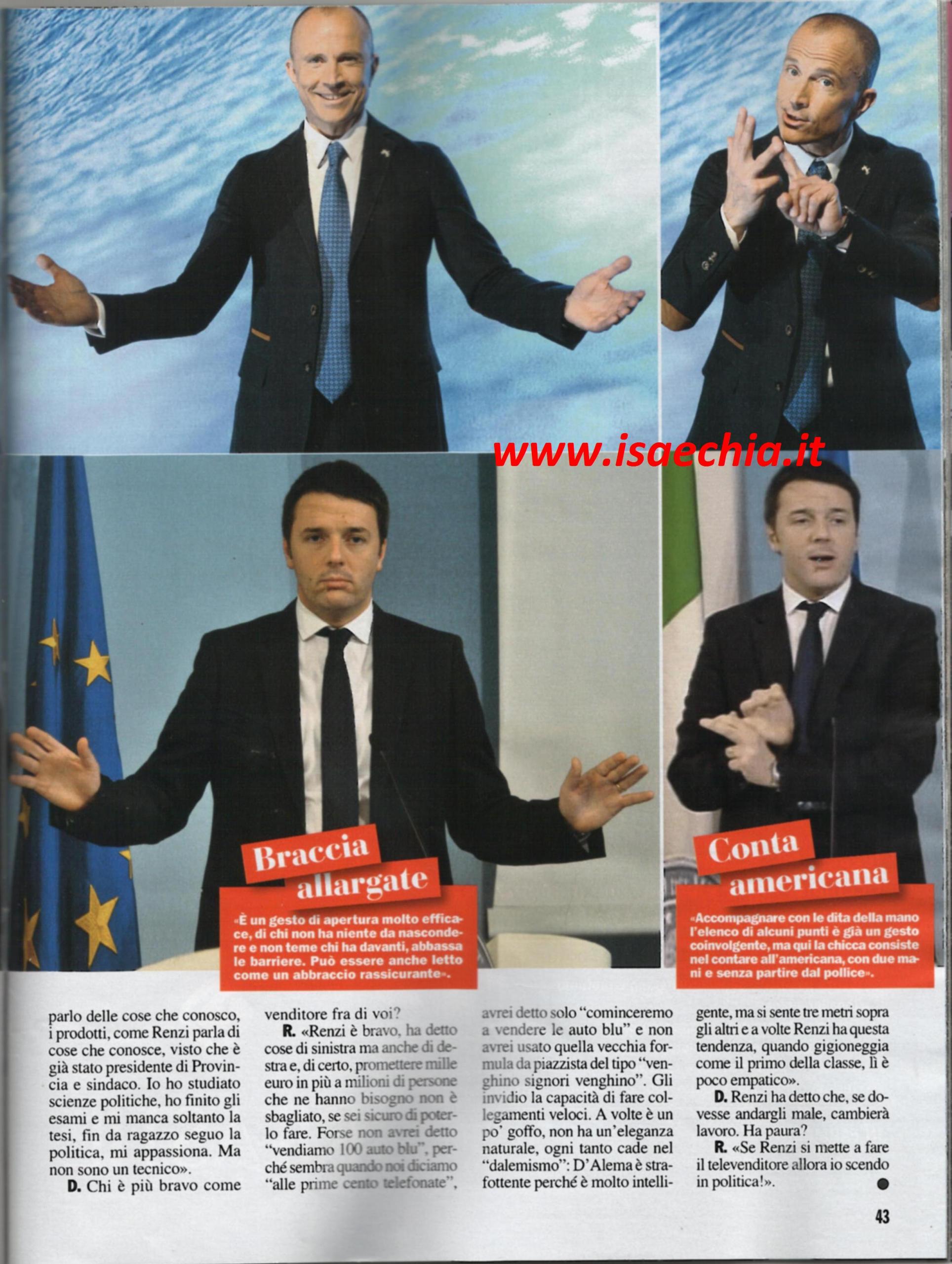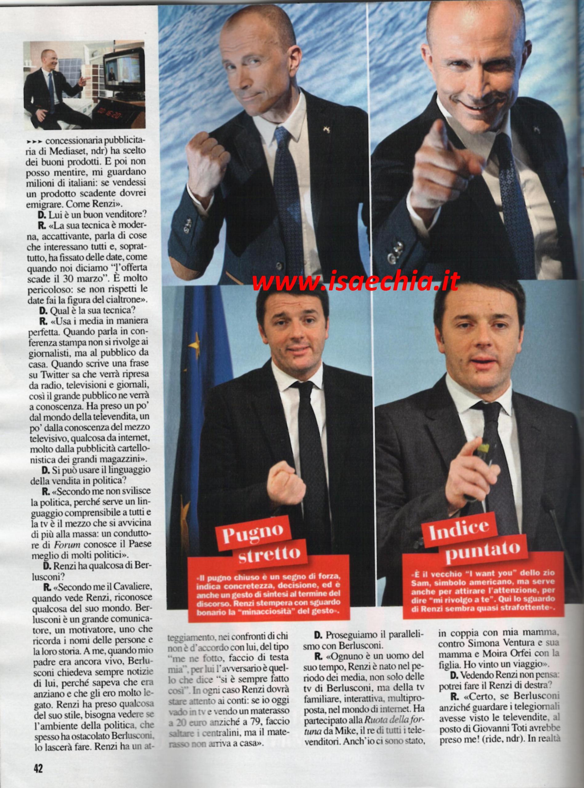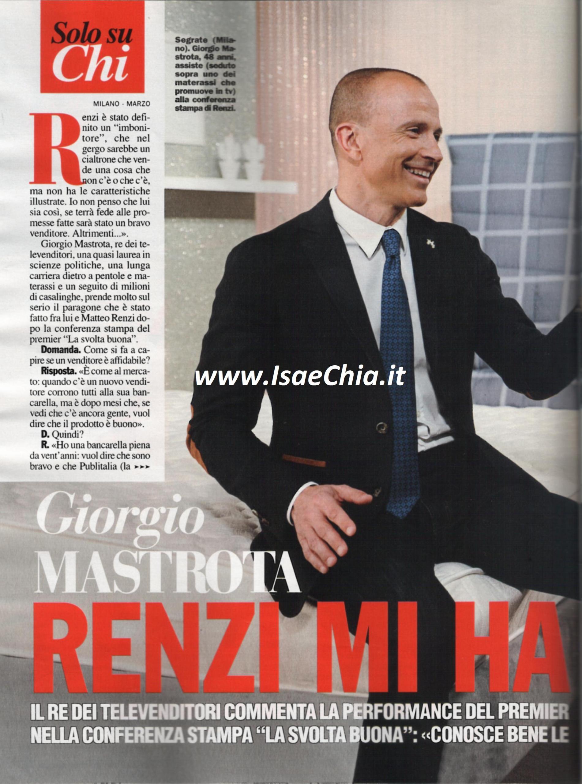 Ne è passato di tempo da quando Giorgio Mastrota era seduto sui primissimi troni di Uomini e donne. Oggi, il televenditore più amato della tv parla del nuovo premier Matteo Renzi: “Lo hanno definito un imbonitore, ma io penso che se terrà fede alle promesse fatte, sarà stato un bravo venditore. Quando c’è un nuovo venditore al mercato, corrono tutti da lui, ma solo dopo mesi, se c’è ancora gente, vuol dire che è un prodotto buono. Io ho una bancarella piena da vent’anni: vuol dire che sono bravo e che Publitalia ha scelto dei buoni prodotti. Non so mentire, non potrei pubblicizzare dei prodotti scadenti: come Renzi, dovrei scappare dall’Italia. Lui è accattivante, parla di cose che interessano tutti e si dà delle date, un po’ come quando noi diciamo “L’offerta scade il 30 marzo”. Usa bene i media: non parla ai giornalisti, ma al pubblico a casa e scrive su Twitter sapendo che verrà riportato da tv, radio e giornali. Silvio Berlusconi è un grande comunicatore e motivatore e ricorda i nomi e le storie delle persone: a me chiedeva di mio padre perché sapeva che era anziano e che ero legato a lui. Renzi ha preso qualcosa del suo stile, ma ha un atteggiamento tipo “Non me ne fotto” verso chi non è d’accordo con lui. E bisogna stare attenti ai conti: se vendo un materasso a 20 euro anziché 79, farò saltare i centralini, ma poi il materasso non arriva a casa. Io seguo la politica da sempre, ho dato tutti gli esami a Scienze Politiche, mi manca solo la tesi di laurea, ma non sono un tecnico. Forse Renzi non avrebbe dovuto dire “Vendiamo 100 auto blu”, è come quando noi diciamo “Alle prime 100 telefonate…”, ma solo “cominceremo a vendere le auto blu” e non usare quello stile “Venghino, signori, venghino”.