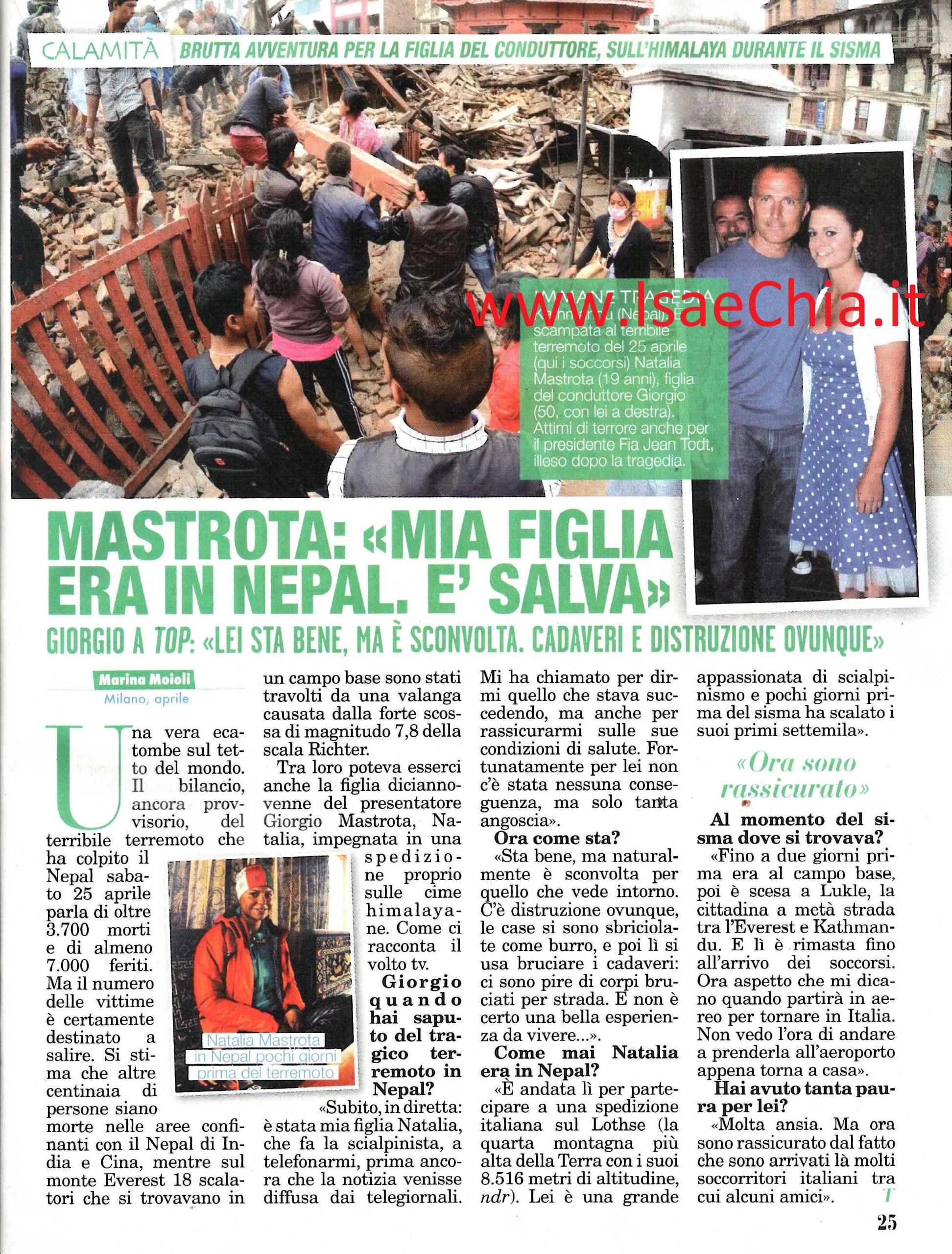 Una vera ecatombe, quella che ha colpito il Nepal lo scorso 25 aprile: un terribile terremoto che ha causato oltre 3700 morti e 7000 feriti. Tra loro poteva esserci anche la figlia diciannovenne del presentatore Giorgio Mastrota, che oggi è protagonista dei messaggi promozionali di Canale 5, ma anni fa è stato uno dei primissimi tronisti di Uomini e Donne. La ragazza, che si chiama Natalia proprio come la madre, l’ex showgirl Natalia Estrada, ed ha 19 anni, si trovava sulle cime dell’Himalaya per una spedizione. Intervistato, Giorgio racconta come ha saputo del terremoto in Nepal: “L’ho saputo subito, in diretta. E’ stata mia figlia, che fa la scialpinista, a telefonarmi prima ancora che la notizia venisse diffusa dai telegiornali. Mi ha chiamato per dirmi quello che stava succedendo, ma anche per rassicurarmi sul suo stato di salute. Fortunatamente, per lei non c’è stata nessuna conseguenza, ma tanta angoscia. Ora sta bene, ma naturalmente è sconvolta per quello che vede intorno. C’è distruzione ovunque, le case si sono sbriciolate come burro e poi lì si usa bruciare i cadaveri: ci sono pire di corpi bruciati per strada e non è certo una bella esperienza da vivere. Natalia era lì per partecipare ad una spedizione italiana sul Lothse, la quarta montagna più alta della Terra. E’ una grande appassionata di scialpinismo e pochi giorni prima del sisma ha scalato i suoi primi settemila. Fino a due giorni prima era al campo base, poi è scesa a Lukle, la cittadina a metà strada tra l’Everest e Kathmandu, e lì è rimasta fino all’arrivo dei soccorsi. Ora aspetto che mi dicano quando partirà in aereo per tornare in Italia. Non vedo l’ora di andare a prenderla all’aeroporto appena torna a casa. Ho provato molta ansia, ma ora sono rassicurato dal fatto che sono arrivati là molti soccorritori italiani, tra cui alcuni amici“.