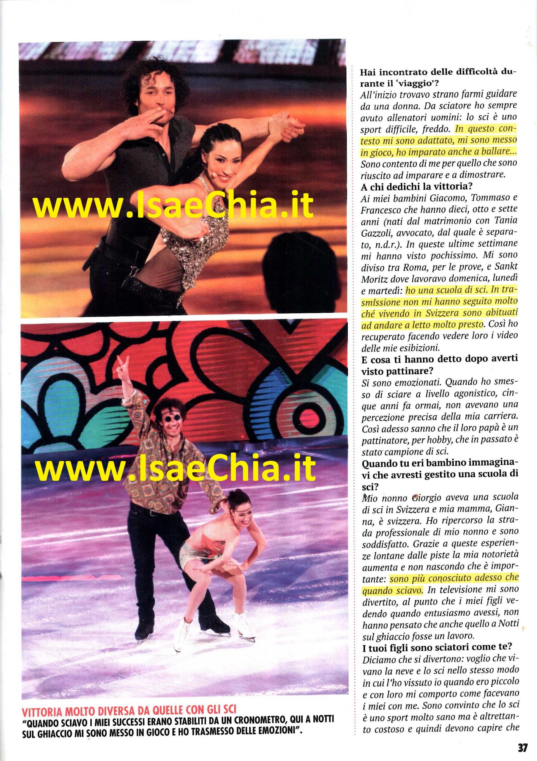Insieme alla sua bella maestra Eve Bentley, il campione di sci Giorgio Rocca è uscito vincitore del programma di Milly Carlucci Notti sul ghiaccio, contro ogni sua aspettativa: “Non potevo mai immaginare che sarebbe andata a finire così. L’ho affrontata come un viaggio: prima di Notti sul ghiaccio, ormai tre anni fa, ho partecipato a Pechino Express, che ho lasciato dopo 5 puntate. Questa vittoria è stata una rivincita, perché anche sul ghiaccio pensavo di arrivare a metà classifica. Invece sono arrivato alla puntata finale. Io ero già felice di scendere in pista. All’inizio trovavo strano farmi guidare da una donna: ho sempre avuto allenatori uomini. Lo sci è uno sport difficile, freddo, in questo contesto mi sono adattato, messo in gioco, imparato a ballare. Dedico la vittoria ai miei figli Giacomo, Tommaso e Francesco, di 10, 8 e 7 anni: in questi giorni mi hanno visto pochissimo perché mi sono diviso tra Roma, dove si tengono le prove, e Sankt Moritz, dove lavoravo domenica lunedì e martedì e dove ho una scuola di sci. In Svizzera hanno seguito poco la trasmissione perché sono abituati ad andare a letto presto, così ho mostrato loro i video. I miei figli si sono emozionati, perché quando ho smesso di sciare a livello agonistico, cinque anni fa, non avevano una percezione della mia carriera. Adesso sanno che il loro papà per hobby è un pattinatore e in passato è stato sciatore“. Quando gli si chiede se i suoi figli sono sciatori come lui, Giorgio risponde: “Diciamo che si divertono. Voglio che vivano la neve e lo sci nello stesso modo in cui l’ho vissuto io e mi comporto come facevano i miei con me. Sono convinto che lo sci è uno sport sano, ma altrettanto costoso e quindi devono capire che sono ragazzi fortunati. Per il 19 marzo sono venuti a trovarmi a Roma e volevano che li portassi proprio a pattinare! Per quella volta ho evitato, ma penso che nelle prossime settimane li vedrò con i pattini!“. Quando gli si chiede se gli fa piacere essere riconosciuto per la partecipazione a dei programmi televisivi o preferisce esserlo per i risultati sportivi, risponde: “E’ un peccato, perché sminuisce i miei successi sportivi. Mi rendo conto che lo sci abbia poca visibilità, quindi il pubblico non ha colpe. A Notti sul ghiaccio sono stato in video per un tempo che vale quanto otto carriere: il pubblico ha imparato ad associare la mia faccia al mio nome. Vincere è stato importante perché sono stati giudicato dagli altri e il giudizio è dipeso dalle emozioni che sono riuscito a trasmettere e non da un cronometro, come quando sciavo. Qui ci ho messo la faccia e dalla faccia ho fatto capire le mie emozioni“. Infine, chiedendogli come ha reagito la sua compagna Gaia quando ha saputo che avrebbe partecipato, Giorgio risponde: “E’ stata molto contenta per me e durante il programma ha sopportato il fatto che io non ci fossi. Ha sofferto un po’ di gelosia ed è comprensibile, dato che ho trascorso due mesi con un’altra donna. Era un contesto lavorativo, ma il contatto fisico era continuo. Al posto suo, non so se ce l’avrei fatta: vedere la mia donna stropicciata da un altro uomo mi avrebbe fatto girare le scatole. Sono un montanaro, ma geloso come un siciliano!“