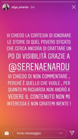 Chi invece non sembra voler dar soddisfazione all’ex tronista e non ha alcuna intenzione di parlare di lui è la sorella gemella di Serena, Elga, che sui social ha scritto: