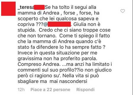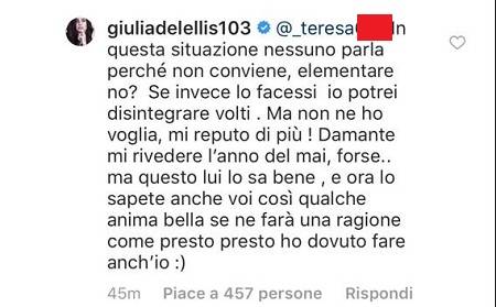 Nelle ultime ore, sul profilo Instagram di Giulia, alcune follower hanno fatto notare che l’ex concorrente del Grande Fratello Vip 2 avrebbe smesso di seguire sui social persino la mamma di Andrea, insinuando che, se la De Lellis ha compiuto un gesto simile, potrebbe essere sintomatico del fatto che probabilmente la signora sapesse dei comportamenti scorretti tenuti dal Damante nei suoi confronti e avrebbe taciuto, quasi avallandoli. Giulietta non si è fatta pregare per rispondere e, anzi, ha ribattuto in maniera decisamente cruda, con parole che levano ogni dubbio ai fan Damellis su un possibile futuro ritorno di fiamma tra lei e il veronese: “In questa situazione nessuno parla perché non conviene. Se invece lo facessi io potrei disintegrare volti. Ma non ne ho voglia, mi reputo di più! Damante mi rivedrà l’anno del mai, forse… ma questo lui lo sa bene!“.