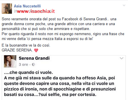 Sul suo profilo Facebook, inoltre, la figlia della Mosetti ha ringraziato Serena Grandi per averla difesa sui social, spiegando di aver confermato, dopo lo scontro a Domenica Live (che trovate cliccando QUI), l’impressione negativa che aveva avuto di Giulia in merito agli attacchi rivolti ad Asia al GF Vip: