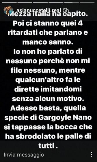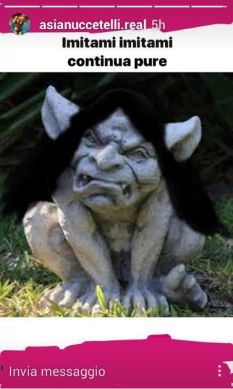 Oggi attraverso il suo Instagram Story, Asia ha usato la medesima arma del sarcasmo, postando prima un messaggio per la De Lellis: