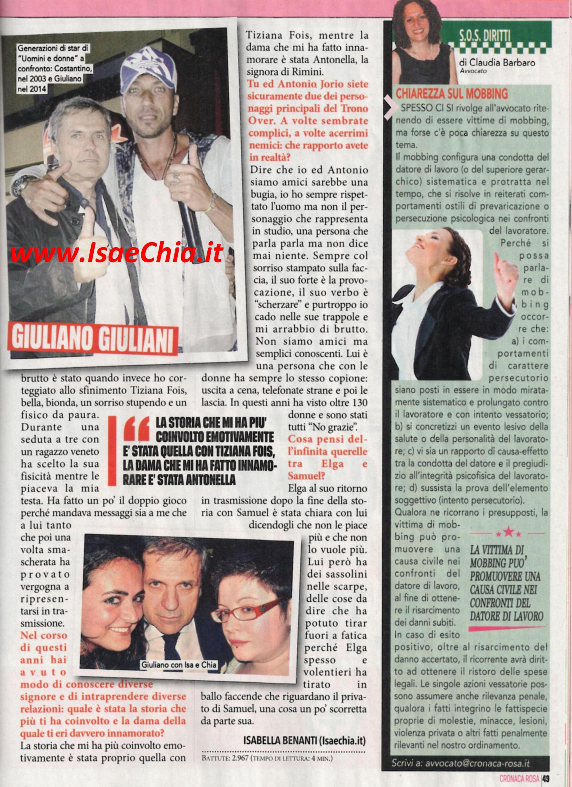 Come vi abbiamo annunciato QUI e nostre blogger Isa e Chia hanno iniziato una collaborazione con la rivista Cronaca rosa, per la quale intervisteranno ogni volta un personaggio della tv. Oggi riportiamo l’intervista che Isabella Benanti ha fatto al protagonista del Trono Over Giuliano Giuliani: “Il ricordo più bello della mia esperienza è quando si è presentata Giuliana Di Bartolomeo per corteggiarmi: io la scelsi tra sei donne, sono uscito con lei per un mese e mi piaceva tanto. La storia non è finita bene perché io ero molto coinvolto, mentre a lei non è scattato nulla. Quello più brutto è stato quando ho corteggiato Tiziana Fois, bella bionda e un fisico da paura: ha fatto un po’ il doppio gioco e alla fine ha scelto un ragazzo veneto che le piaceva per la fisicità, mente io l’attraevo di testa. Quella con Tiziana è stata la storia che mi ha coinvolto di più, ma mi sono innamorato con Antonella Bravi, la signora di Rimini (ora sposata con Tony De Leonardis)”. Quando gli si chiede del suo rapporto da amici-nemici con l’altro “senatore” Antonio Jorio, risponde: “Dire che siamo amici sarebbe una bugia. Ho sempre rispettato l’uomo, ma non il personaggio che rappresenta nello studio, una persona che parla, parla, ma non dice mai niente. Sempre col sorriso stampato sulla faccia, il suo forte è la provocazione, ma io cado nelle sue trappole e poi mi arrabbio di brutto. Non siamo amici, ma semplici conoscenti. Con le donne ha sempre lo stesso copione: uscita a cena, telefonate strane e poi le lascia. Ha visto oltre 130 donne, ma la sua risposta è stata sempre ‘no grazie’!”. Quando gli si chiede di Elga Profili e Samuel Baiocchi, invece, dice: “Al suo ritorno in trasmissione Elga è stata chiara, non lo vuole più. Lui però ha dei sassolini nelle scarpe e delle cose da dire che però non ha potuto tirare fuori, perché lei spesso e volentieri tirava in ballo faccende della vita privata di Samuel, cosa un po’ scorretta da parte sua”.