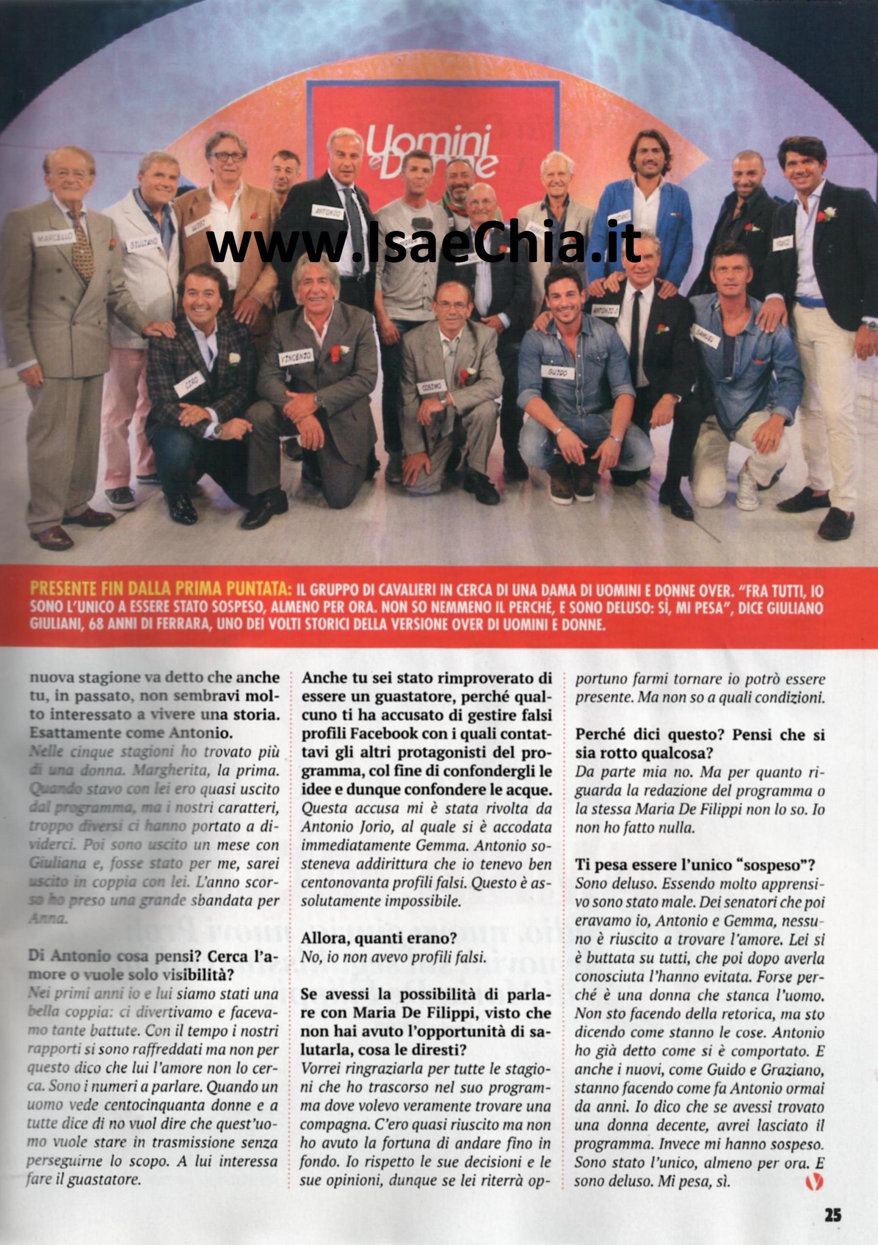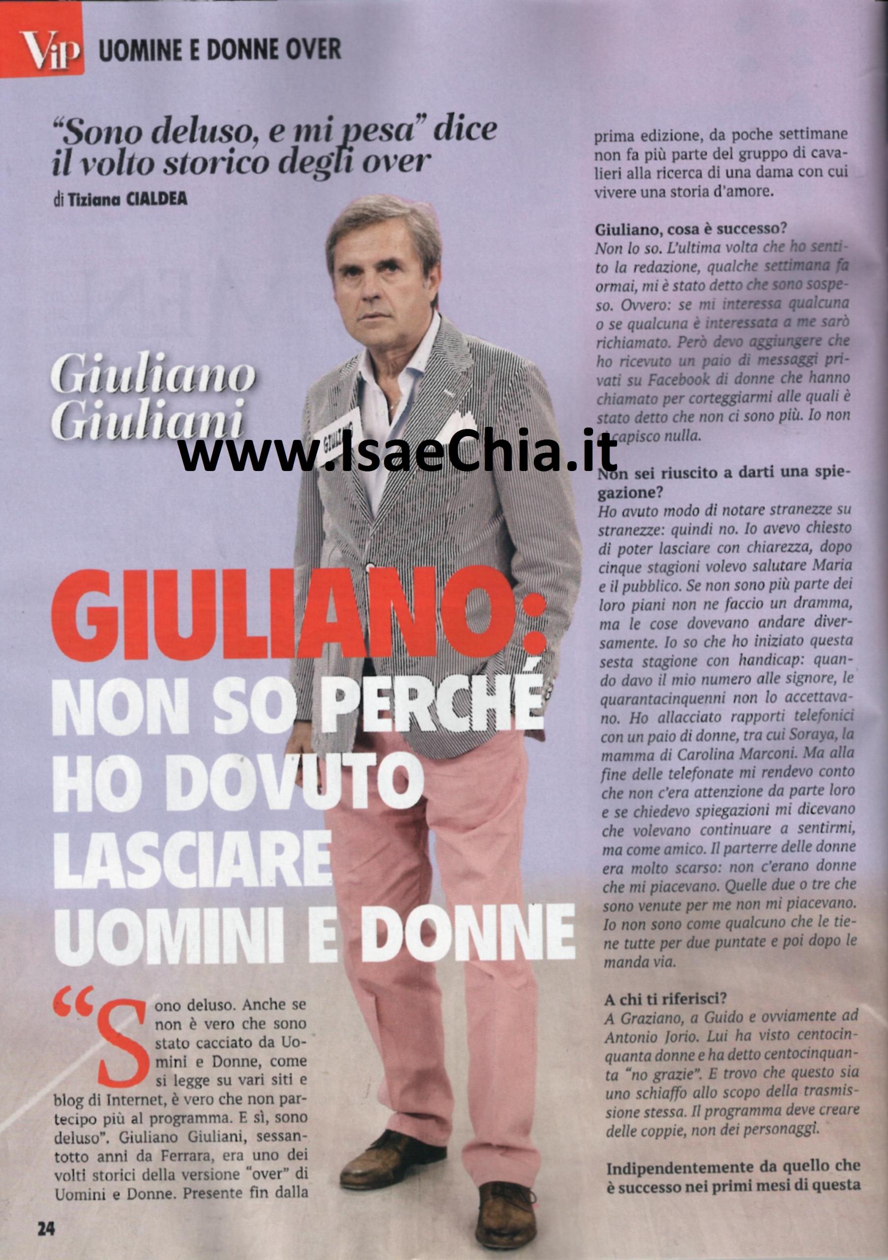 Alcune settimane fa, dopo oltre cinque anni di presenza nel programma, Giuliano Giuliani non è stato confermato dalla redazione di Uomini e donne. E il protagonista del Trono Over, forse anche in seguito all’arrabbiatura, è stato anche ricoverato in ospedale (QUI per leggere l’articolo a riguardo): non si rassegna al cambiamento, forse perché non si spiega la decisione della redazione. “Non so cosa sia successo, l’ultima volta che ho sentito la redazione, mi hanno detto che ero ‘sospeso’, ovvero che se mi interessa qualcuna, o qualcuna è interessata a me, sarò richiamato. Però ho ricevuto dei messaggi su Facebook da donne che avevano chiamato per me e alle quali è stato detto che non c’ero più. Ho avuto modo di notare delle stranezze. Avevo chiesto di lasciare il programma con serenità e di salutare tutti; se non sono più parte del loro programma non è un dramma, ma non dovevano andare così le cose. Quest’anno sono partito con un handicap: quando davo il numero alle 45enni, non lo accettavano. Ho dato il numero anche a Soraya, la mamma della gieffina Carolina Marconi, ma alla fine delle telefonate mi rendevo conto che non c’era attrazione e volevano solo amicizia. Nel parterre non c’erano donne che mi piacevano e quelle che sono venute non mi piacevano. Io non sono uno di quelli che le tiene per due puntate e poi le manda via. Mi riferisco a Graziano Amato, a Guido Soldati e ad Antonio Jorio, che ha visto 150 donne e ha detto 150 “no grazie”. Questo è uno schiaffo al programma, il cui scopo è trovare l’amore. Io sono uscito due volte, una con Margherita e un’altra con Giuliana; l’anno scorso, invece, avevo preso una sbandata per Anna. I primi tempi io e Antonio formavamo una bella coppia, ci divertivamo e facevamo battute. Con il tempo i nostri rapporti si sono raffreddati e dico che lui non cerca l’amore: i numeri parlano. Quando uno dice 150 no vuol dire che non segue lo scopo della trasmissione, ma sta lì a fare il guastatore”. Quando gli si fa notare che anche lui non è stato da meno ed è stato accusato di creare scompiglio su Facebook, risponde: “Quest’accusa mi è stata rivolta da Antonio ed è stata appoggiata da Gemma Galgani, ma io non ho creato nessun profilo falso. Gemma si è buttata su tutti, ma dopo averla conosciuta, l’hanno evitata. Se avessi trovato una donna decente, io avrei lasciato il programma; invece, mi hanno sospeso. Tuttavia, vorrei ringraziare Maria De Filippi per tutte le stagioni trascorse nel programma; rispetto le sue decisioni e se lei lo riterrà opportuno, io potrò essere presente, ma non so a quali condizioni. Da parte mia non si è rotto nulla, ma per quanto riguarda la redazione o la stessa Maria, non lo so. Io non ho fatto nulla!”.