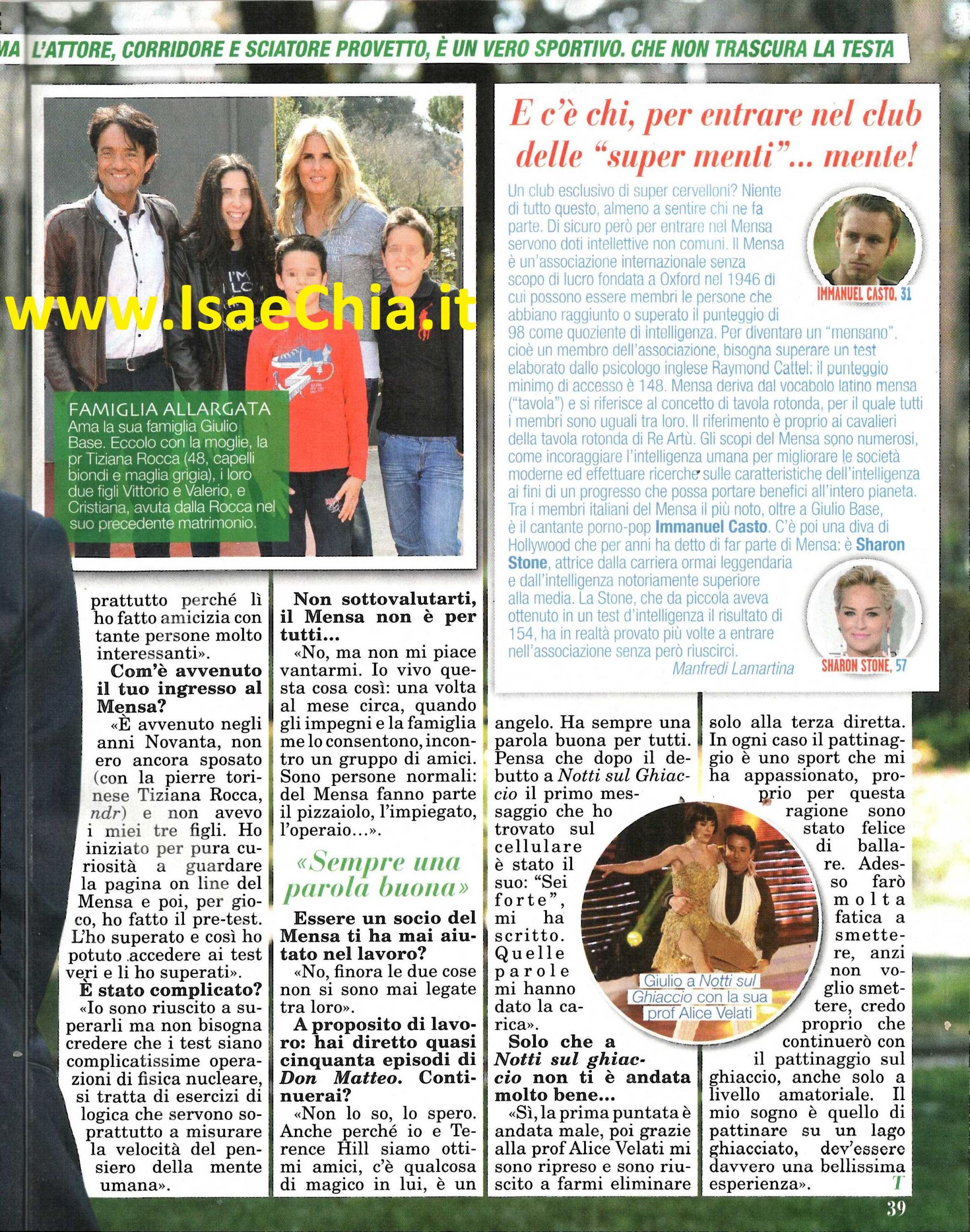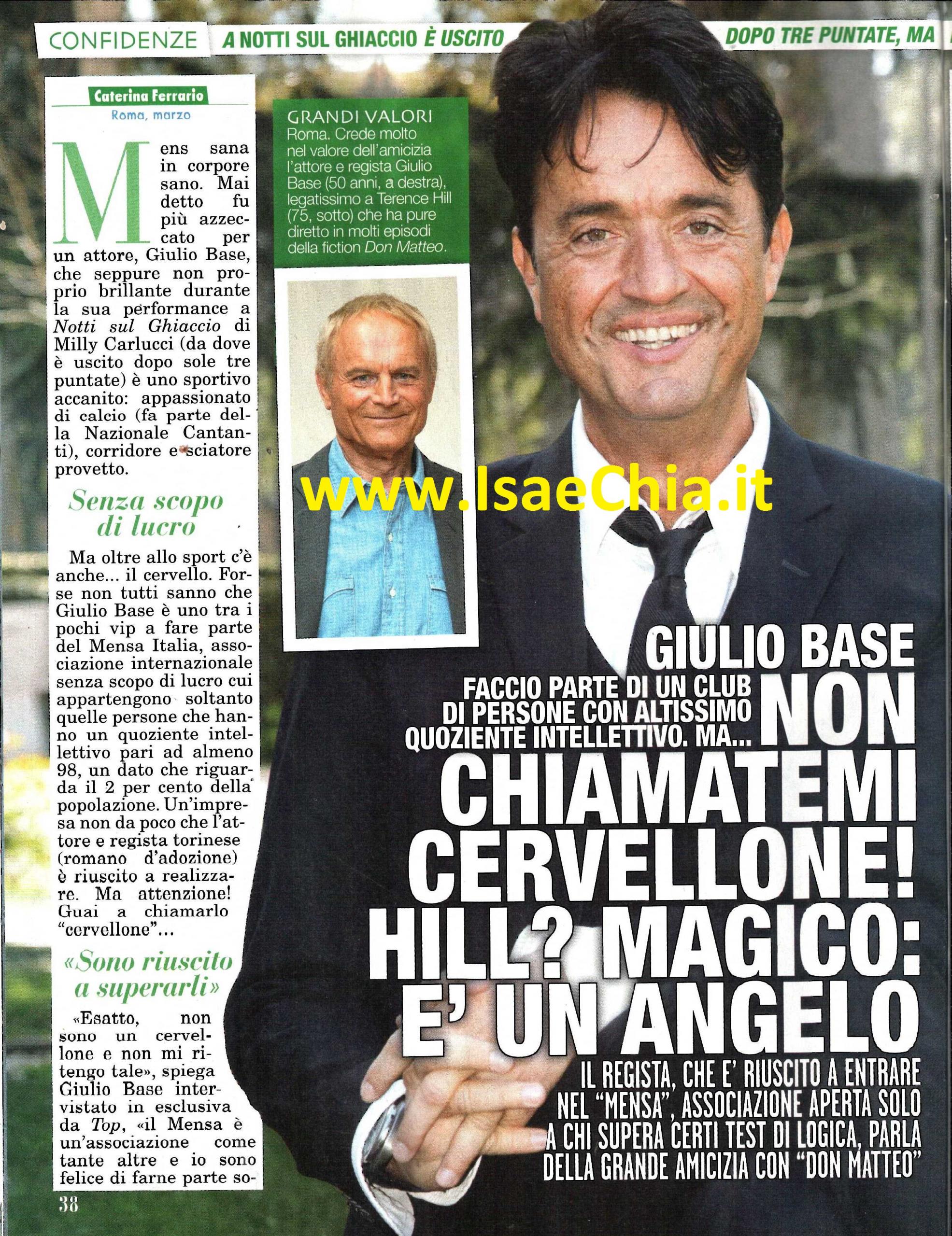 L’attore Giulio Base non è stato protagonista di una performance proprio brillante nel programma di Milly Carlucci Notti sul ghiaccio, ma è uno sportivo accanito ed è anche nella Nazionale Calcio Cantanti). Ma non solo! Forse pochi sanno che fa parte del Mensa Italia, associazione internazionale a cui appartengono solo quelle persone che hanno un quoziente intellettivo pari ad almeno 98, ossia il 2% della popolazione. Ma attenzione, guai a chiamarlo ‘cervellone’! “Esatto, non sono un cervellone e non mi ritengo tale. Il Mensa è un’associazione come tante altre e io sono felice di farne parte soprattutto perché ho fatto amicizia con tante persone interessanti. Il mio ingresso è avvenuto negli anni Novanta, quando non ero ancora sposato con Tiziana Rocca e non avevo figli. Ho iniziato per pura curiosità a guardare la loro pagina online e per gioco ho fatto il pre-test. L’ho superato e così ho potuto accedere ai test veri e li ho superati. Non sono operazioni di fisica nucleare, si tratta di esercizi di logica, che servono soprattutto per misurare la velocità della mente umana. Non mi piace vantarmi. Io vivo questa cosa così: una volta al mese circa, incontro un gruppo di amici. Gli altri membri del Mensa sono persone normali: impiegati, pizzaioli…E finora questa cosa non è mai stata legata al lavoro“. A proposito di lavoro, recentemente Giulio ha diretto 50 episodi della fiction Don Matteo. Quando gli si chiede se continuerà, risponde: “Non lo so, lo spero, anche perché io e Terence Hill siamo ottimi amici. C’è qualcosa di magico in lui, è un angelo. Ha sempre una buona parola per tutti. Pensa che dopo il debutto a Notti sul ghiaccio, il primo messaggio che ho trovato sul cellulare era il suo; mi ha detto ‘Sei forte’ e quelle parole mi hanno dato la carica. La prima puntata di Notti sul ghiaccio non è andata bene, ma grazie alla prof Alice Velati mi sono ripreso e sono arrivato alla terza diretta. In ogni caso, il pattinaggio mi ha appassionato e sono stato felice di ballare. Adesso non voglio smettere, credo che continuerò il pattinaggio su ghiaccio anche a livello amatoriale: il mio sogno è pattinare un lago ghiacciato!“.