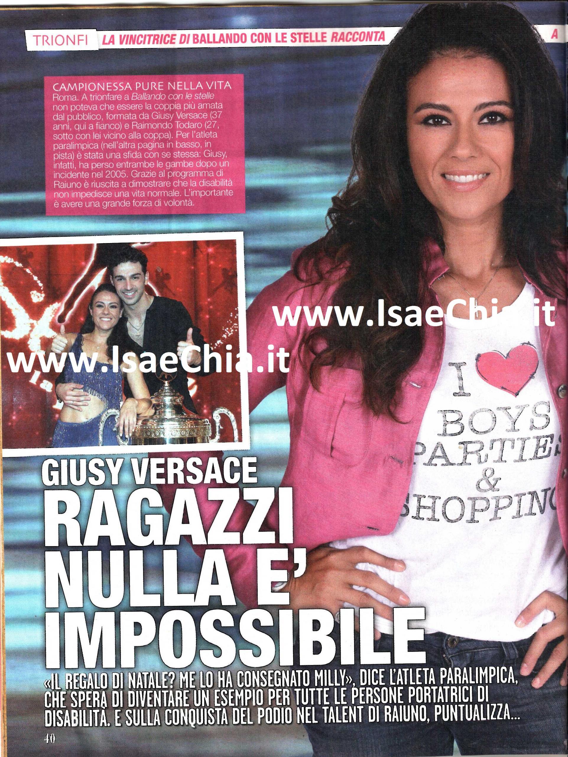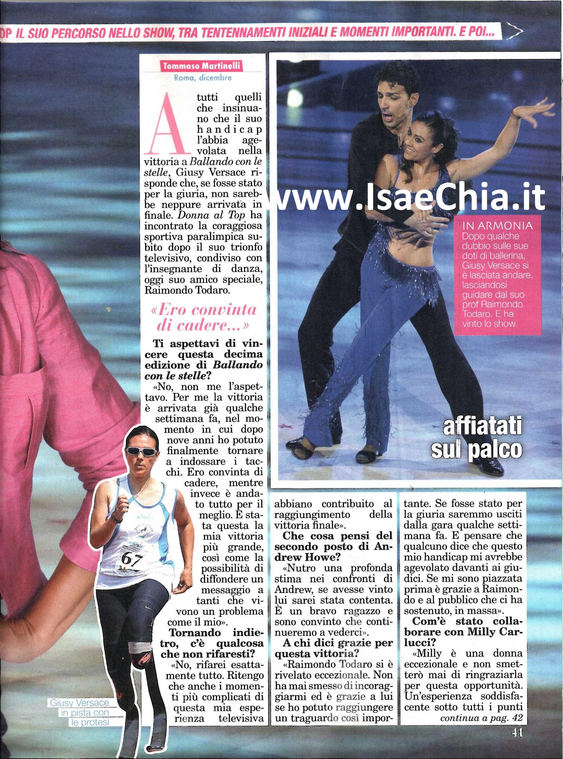 L’atleta paralimpica Giusy Versace è stata incoronata vincitrice dell’edizione di Ballando con le stelle che si è appena conclusa, insieme al suo maestro di ballo Raimondo Todaro: “Non me l’aspettavo. Per me la vittoria era arrivata già qualche settimana fa, quando dopo nove anni ho potuto tornare a indossare i tacchi. Ero convinta di cadere, invece tutto è andato per il meglio. Rifarei esattamente tutto, anche i momenti più complicati hanno contribuito al raggiungimento della vittoria. Nutro profonda stima nei confronti di Andrew Howe, e se avesse vinto, sarei stata contenta per lui. E’ un bravo ragazzo e credo che continueremo a vederci. Raimondo è stato eccezionale. Non ha mai smesso di incoraggiarmi ed è grazie a lui se ho potuto raggiungere un traguardo così importante. Se fosse stato per la giuria, sarei uscita qualche settimana fa. E pensare che qualcuno dice che il mio handicap mi ha agevolata davanti ai giudici! Se mi sono piazzata prima è grazie a Raimondo e al pubblico che mi ha sostenuto in massa. Milly Carlucci è una donna eccezionale e non smetterò mai di ringraziarla per l’opportunità che mi ha dato. All’inizio ho avuto qualche tentennamento, ma poi ho deciso di lasciarmi andare e conserverò sempre nel cuore quest’esperienza“. Giusy conclude ricordando il momento più emozionante e parlando del suo regalo di Natale,…speciale: “Quando ho perso le protesi in diretta. Sono andata nel pallone, non sapevo come avrebbe potuto reagire Raimondo, ma fortunatamente l’ha capito e abbiamo sdrammatizzato. Credo che il pubblico abbia percepito la nostra energia. Continueremo assolutamente e frequentarci, è nata una bella amicizia. Il mio fidanzato Antonio Magra è straordinario: mi faceva sentire bella anche quando, dopo l’incidente, non riuscivo a guardarmi nello specchio. La mia famiglia è fiera della mia vittoria. Il mio regalo di Natale l’ho già avuto in anticipo, da Milly. Spero che i ragazzi che hanno delle disabilità guardandomi in tv, capiscano che nulla è impossibile“.