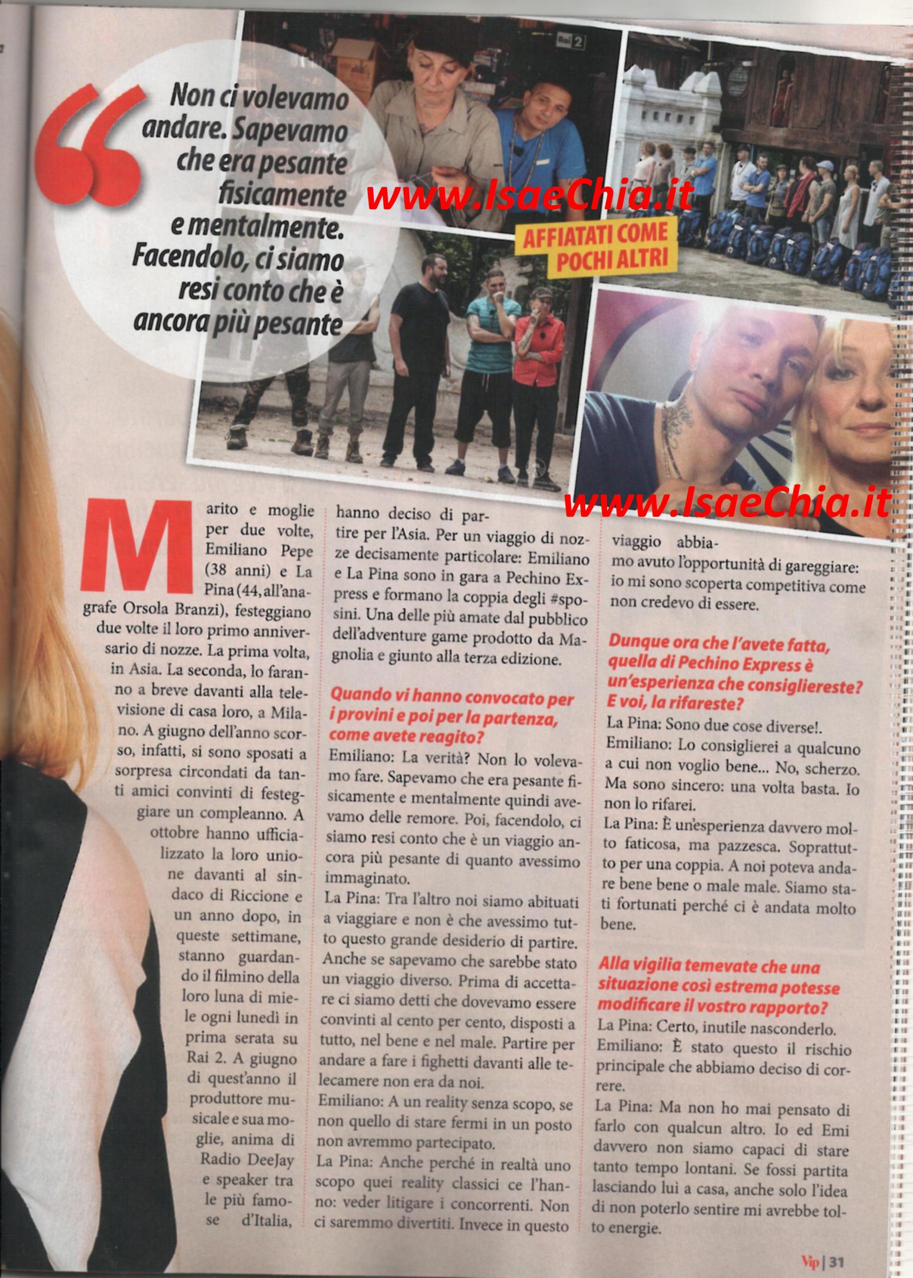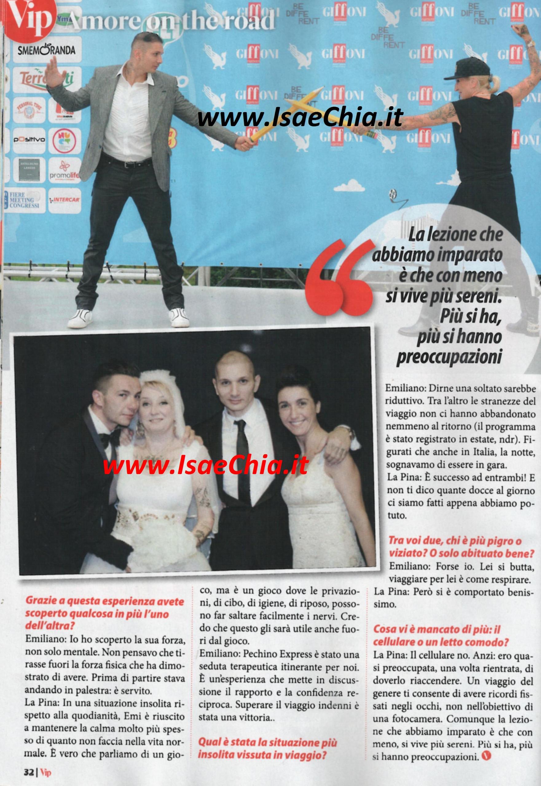 In questi giorni stiamo guardando la terza edizione di Pechino Express, che vede tra le coppie concorrenti quella degli Sposini, ossia la conduttrice radiofonica La Pina e il produttore discografico e cantante Emiliano Pepe. Ma i due sono già di ritorno in Italia e raccontano: “Quando ci hanno contattati, non lo volevamo fare. Sapevamo che era pesante fisicamente e mentalmente, quindi avevamo delle remore. Poi facendolo, ci siamo resi conto che è più pesante di quello che avessimo immaginato! Non siamo abituati a viaggiare, quindi non è che avessimo tutto questo grande desiderio di partire, anche se sapevamo che sarebbe stato un viaggio diverso. Prima di partire, dovevamo essere sicuri al 100%: non volevamo fare i fighetti davanti alle telecamere. Ad un reality senza scopo non avremmo partecipato. Quelli in realtà hanno uno scopo: vedere i concorrenti litigare e noi non ci saremmo divertiti” dicono i due. Quando si chiede loro se la rifarebbero, Emiliano scherzando risponde: “Lo consiglierei a qualcuno a cui non voglio bene! No scherzo, una volta va bene, non lo rifarei” e La Pina conferma: “E’ un’esperienza faticosa, ma pazzesca, soprattutto per una coppia. A noi poteva andare bene bene o male male. Sapevamo che rischiavamo di modificare il nostro rapporto. Ma non ho mai pensato di farlo con qualcun altro. Io ed Emi non siamo capaci di stare tanto tempo lontani. Se avessi lasciato lui a casa, anche l’idea di non poterlo sentire mi avrebbe tolto le energie”.