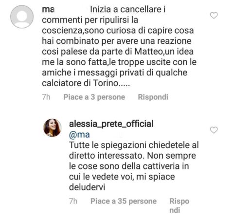 Curiosi di scoprire cosa stesse succedendo tra il calciatore e la studentessa di Torino, i followers della Prete l’hanno inizia a tempestare di domande, finché la giovane non ha deciso di rispondere in maniera alquanto lapidaria: “Tutte le spiegazioni chiedetele al diretto interessato! Non sempre le cose sono della cattiveria in cui le vedete voi!”.