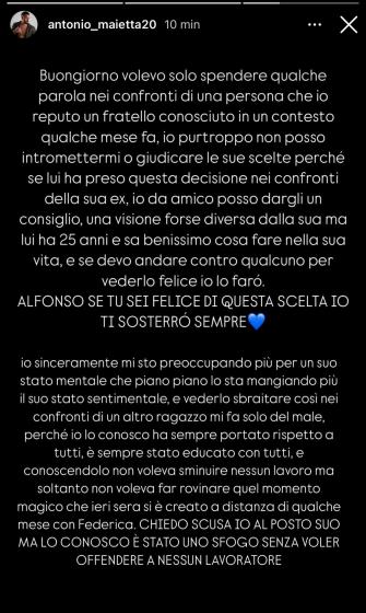 Buongiorno, volevo solo spendere qualche parola nei confronti di una persona che io reputo un fratello conosciuto in un contesto qualche mese fa. Io purtroppo non posso intromettermi o giudicare le sue scelte perché se lui ha preso questa decisione nei confronti della sua ex, io da amico posso dargli un consiglio, una visione forse diversa dalla sua, ma lui ha 25 anni e sa benissimo cosa fare nella sua vita, e se devo andare contro qualcuno per vederlo felice io lo farò. ALFONSO SE TU SEI FELICE DI QUESTA SCELTA IO TI SOSTERRÒ SEMPRE. Io sinceramente mi sto preoccupando più per un suo stato mentale che piano piano lo sta mangiando più il suo stato sentimentale, e vederlo sbraitare così nei confronti di un altro ragazzo mi fa solo del male, perché io lo conosco: ha sempre portato rispetto a tutti, è sempre stato educato con tutti, e conoscendolo non voleva sminuire nessun lavoro, ma soltanto non voleva far rovinare quel momento magico che ieri sera si è creato a distanza di qualche mese con Federica. CHIEDO SCUSA IO AL POSTO SUO MA LO CONOSCO È STATO UNO SFOGO SENZA VOLER OFFENDERE A NESSUN LAVORATORE.