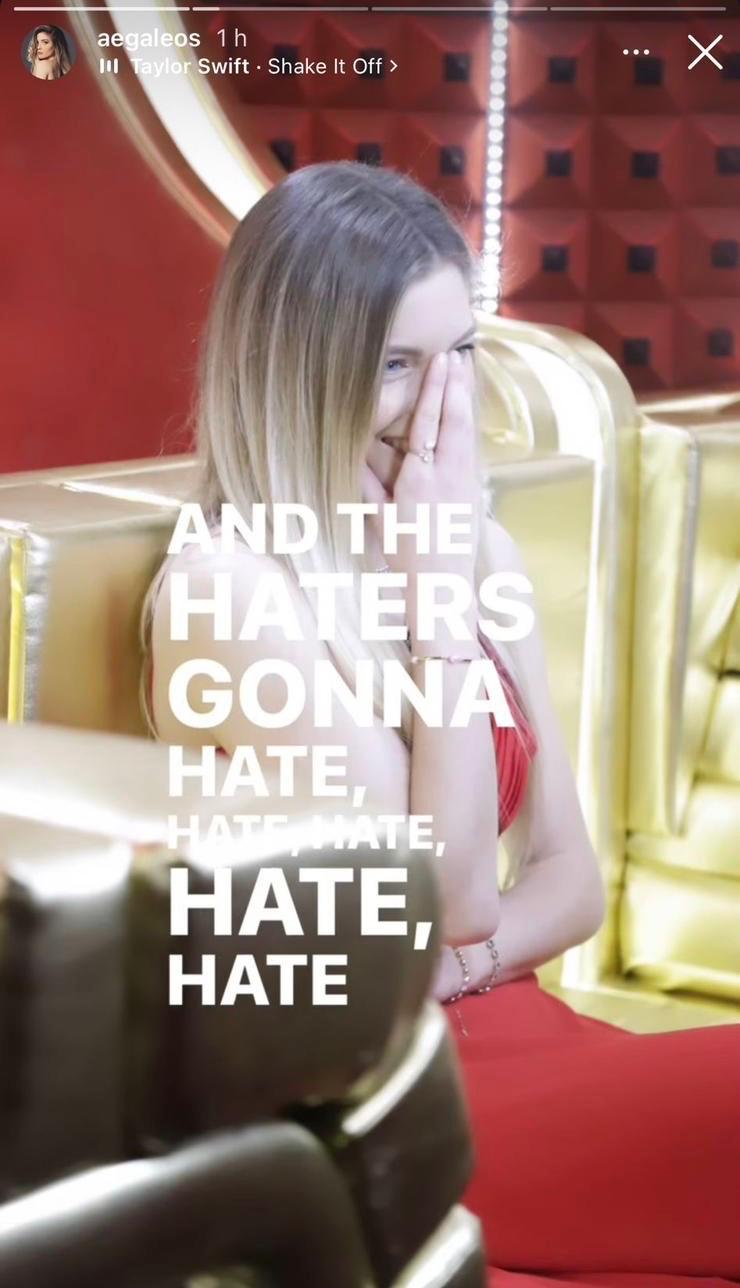 Nella prima, come didascalia a una foto in cui appare sorridente nel Confessionale, ha postato una strofa tratte dalla canzone di Taylor Swift Shake it Off che recita: