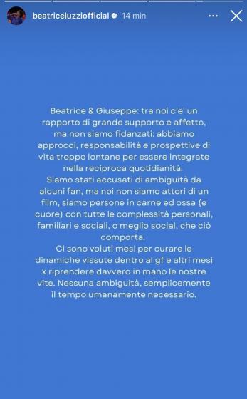 Beatrice e Giuseppe: tra noi c’è un rapporto di grande supporto e affetto, ma non siamo fidanzati: abbiamo approcci, responsabilità e prospettive di vita troppo lontane per essere integrate nella reciproca quotidianità. Siamo stati accusati di ambiguità da alcuni fan, ma noi non siamo attori di un film, siamo persone in carne e ossa (e cuore) con tutte le complessità personali, familiari e sociali, o meglio social, che ciò comporta. Ci sono voluti mesi per curare le dinamiche vissute dentro al gf e altri mesi per riprendere davvero le nostre vite. Nessuna ambiguità, semplicemente il tempo umanamente necessario.