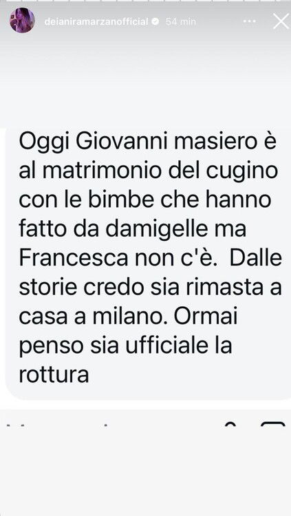 Oggi Giovanni Masiero è al matrimonio del cugino con le bimbe che hanno fatto da damigelle ma Francesca non c’è. Dalle storie credo sia rimasta a casa a Milano. Ormai penso sia ufficiale la rottura.