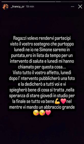 Ragazzi volevo rendervi partecipi visto il vostro sostegno che purtroppo lunedì né io né Simone saremo in puntata. Ero in lista da tempo per un intervento di salute e lunedì mi hanno chiamata per questa cosa. Visto tutto il vostro affetto, lunedì dopo l’intervento pubblicherò una foto e la dedicherò a tutti voi e vi spiegherò bene di cosa si tratta, nella speranza di stare giovedì in studio per la finale se tutto va bene. Nel mentre vi mando un abbraccio grande
