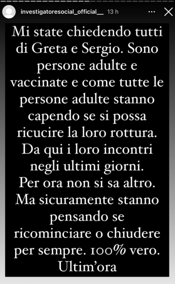 Mi state chiedendo tutti di Greta e Sergio. Sono persone adulte e vaccinate e come tutte le persone adulte stanno capendo se si possa ricucire la loro rottura. Da qui i loro incontri negli ultimi giorni. Per ora non si sa altro. Ma sicuramente stanno pensando se ricominciare o chiudere per sempre. 100 % vero. Ultim’ora.