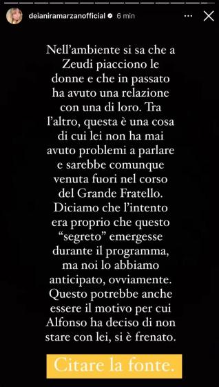 Nell’ambiente si sa che a Zeudi piacciono le donne e che in passato ha avuto una relazione con una di loro. Tra l’altro, questa è una cosa di cui lei non ha mai avuto problemi a parlare e sarebbe comunque venuta fuori nel corso del Grande Fratello. Diciamo che l’intento era proprio che questo “segreto” emergesse durante il programma, ma noi lo abbiamo anticipato, ovviamente.