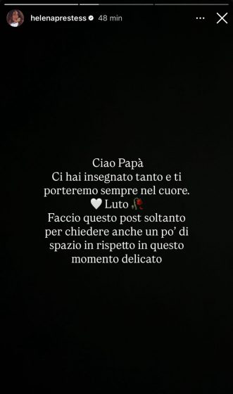 Dopo lo spaventi iniziale, però, la situazione sembrava essere rientrata e per questo motivo, Helena aveva deciso di fare ritorno in Italia. Purtroppo, però, le cose sono rapidamente peggiorate e poco fa la Prestes tramite una storia Instagram ha comunicato la scomparsa del padre, chiedendo anche di rispettare questo momento delicato: