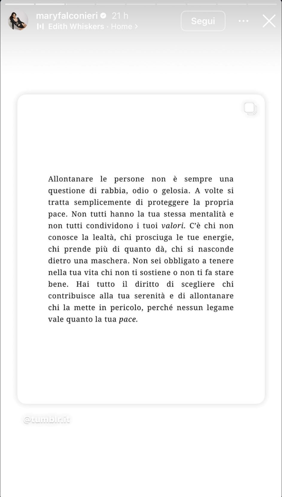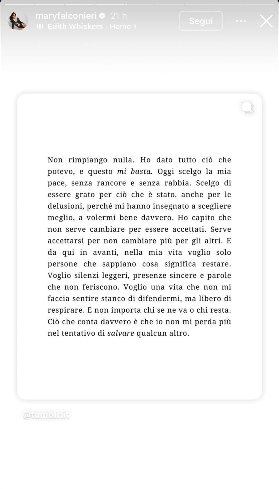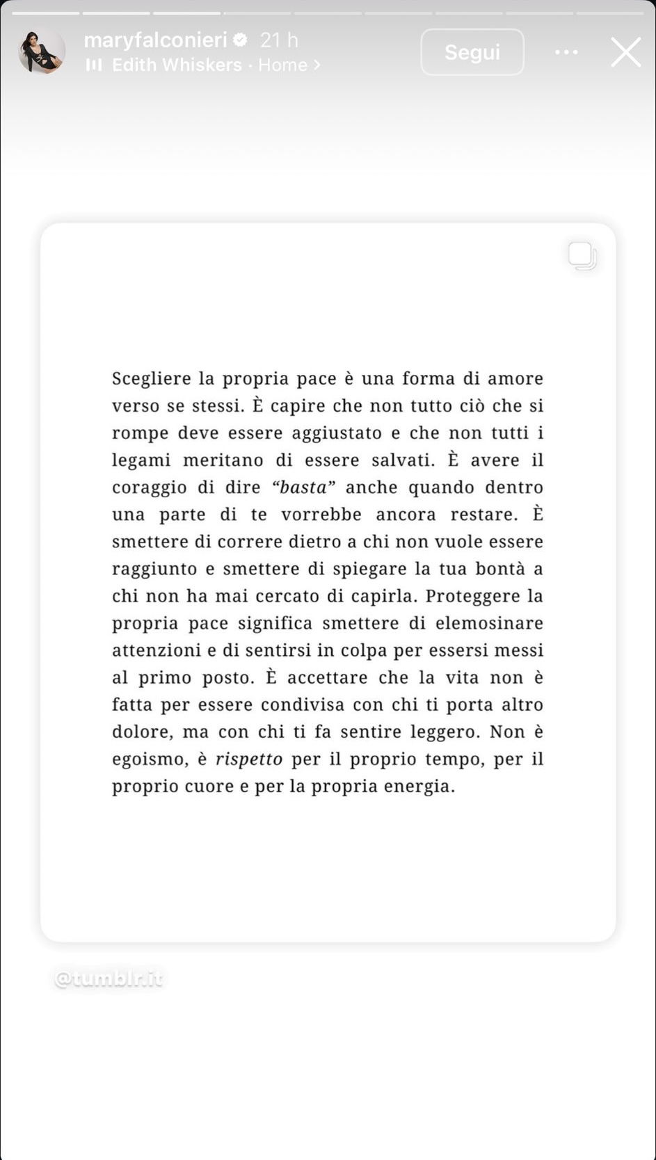 Nelle sue storie Instagram poi ha repostato alcune frasi che sembrano essere rivolte proprio alla fine della sua storia con Giuseppe e i motivi per cui ha deciso di scegliere la sua pace nonostante il dolore provato per la fine della relazione.